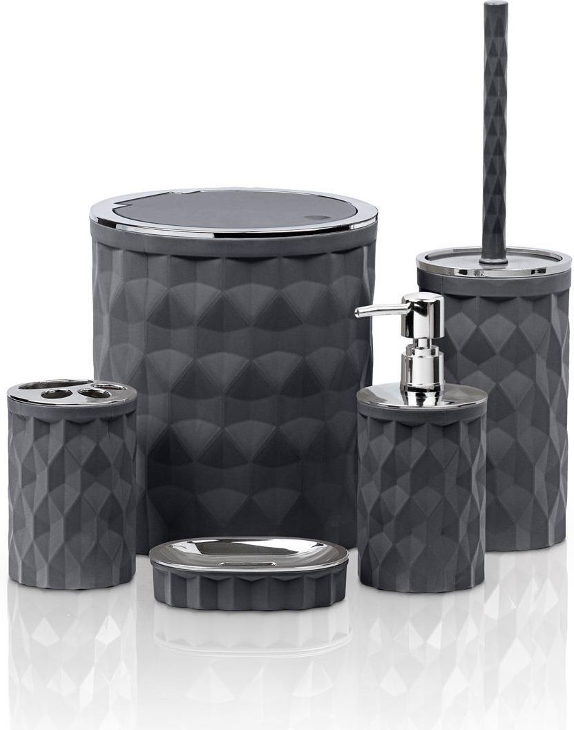 Komplet łazienkowy 5 el Diamond antracyt Nadaj swojej łazience nowy wymiar elegancji dzięki naszemu kompletnemu zestawowi łazienkowemu składającemu się z pięciu niezbędnych elementów. Stworzony z myślą o funkcjonalności i stylu, ten zestaw nie tylko ułatwi codzienne czynności, ale także dodatkowo ozdobi Twoją przestrzeń łazienkową.Zestaw obejmuje:Mydelniczkę - praktyczne i eleganckie miejsce na Twoje ulubione mydło, zachowujące je zawsze w zasięgu ręki.Pojemnik na szczoteczki do zębów - idealny sposób na przechowywanie szczoteczek w higieniczny sposób, dbając o czystość Twojej przestrzeni.Dyspenser na mydło - wygodny i estetyczny sposób na przechowywanie płynnego mydła, zapewniający jego łatwe i czyste dozowanie.Szczotka toaletowa - niezbędny element łazienki, który nie tylko spełnia swoje funkcje, ale także prezentuje się stylowo i schludnie.Kosz na śmieci - dyskretny, ale funkcjonalny, zapewniający czystość i porządek w łazience.Każdy element tego zestawu został starannie zaprojektowany, aby pasować do różnyc Specyfikacja: Styl1: nowoczesny Styl2: klasyczny Odcienie1: srebrny Wysokość całkowita: 29 cm Szerokość całkowita: 20 cm Materiał1: Tworzywo sztuczne Głębokość całkowita: 20 cm Przeznaczenie: do wnętrz Grupa docelowa: uniwersalne Kraj pochodzenia: Turcja W ofercie: dozownik do mydła - 1 szt, pojemnik na szczoteczki - 1 szt, mydelniczka - 1 szt, szczotka do toalety - 1 szt, kosz na śmieci - 1 szt Ilość paczek: 1 Waga: 1,0708064516129 kg Wzór: gładki Kod EAN: 8680801684672 Wymiary szczegółowe: Dozownik do mydła: 18,8/8,5/8,5 cm; Pojemnik na szczoteczki: 12,5/8,5/8,5 cm; Mydelniczka 2,9/12,5/9 cm; Szczotka do toalety: 36,5/10,5/10,5 cm, Kosz na śmieci: 22,5/19/19 cm Kształt: okrągły Odcienie2: szary