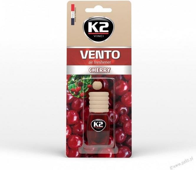 K2 - VENTO SOLO - ZAPACH ODŚWIEŻACZ - WIŚNIA K2 Vento to elegancki odświeżacz powietrza do samochodu o nowoczesnym designie i funkcjonalnym mocowaniu. Dzięki największej pojemności wśród odświeżaczy do samochodu – 8ml, K2 Vento to najlepiej sprzedający się odświeżacz powietrza z oferty K2. Absolutny hit sprzedażowy od kilku lat. Każdy zapach to inny kolor płynu, który współgra z kolorem sznureczka. Żywe kolory rozweselą wnętrze każdego samochodu. Aplikator odświeżacza powietrza K2 Vento zaprojektowany został tak, aby zapach dozować stopniowo w minimalnych ilościach. Drewniany korek nasącza się substancją zapachową i w ten sposób powoli ją uwalnia dzięki czemu może realnie pachnieć nawet do 6 tygodni. Cechy odświeżacza powietrza do samochodu K2 Vento: szklany flakonik nakrętka z drewna egzotycznego opaska z regulacją wysokości korek zabezpieczający Przed pierwszym użyciem należy odkręcić korek i wyciągnąć zatyczkę.