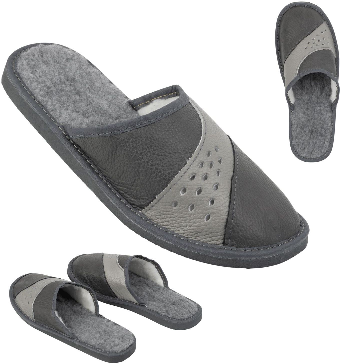 Klapki pantofle męskie skórzane kapcie góralskie ocieplane M87 szare Biała Podlaska