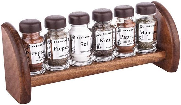 CECHY PRODUKTU:Produkt wykonany został z wysokiej jakości drewna oraz szkła.W skład zestawu wchodzą: drewniany stojak na przyprawy, przyprawniki wraz z przyprawami.Pojemniczki sprzedawane są w zestawie z przyprawami takimi jak: sól, pieprz, kminek, papryka słodka, majeranek, przyprawa do drobiu.Półka posiada możliwość zawieszenia.DANE TECHNICZNE:Wymiary półki:30x12x7,2cmWymiary przyprawnika:8,5x4cmProdukt posiada atest HŻ-4110/14/47-2/10.