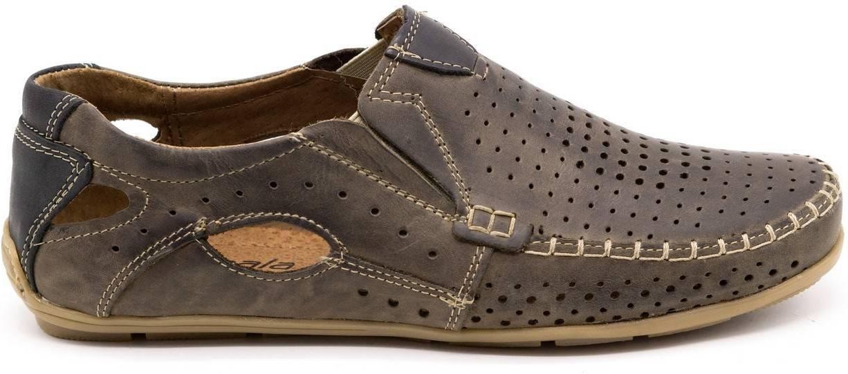 Buty męskie mokasyny skórzane na lato ażurowe POLSKIE 901 brązowe Mokasyny męskie skórzane to obuwie, bez którego trudno wyobrazić sobie stylizację modnego mężczyzny w cieplejszej części roku. Pasują do lżejszych spodni, na przykład lnianych. Ponieważ najczęściej nosi się je założone bezpośrednio na gołe stopy, ważne jest zwrócenie uwagi na wysoką jakość wykonania. Prezentowane mokasyny męskie są przygotowane w całości ze skóry. Materiał zewnętrzny to skóra naturalna, natomiast w środku znajduje się także skórzana wkładka. Dzięki temu buty zapewniają idealną cyrkulację powietrza i zapobiegają przepacania się stóp nawet przy wysokich temperaturach na zewnątrz. Mokasyny męskie są wsuwane, dlatego zakłada się je bardzo szybko. Delikatna guma po bokach ułatwia ich ubieranie na stopę, a do tego sprawia, że buty świetnie się dopasowują. Lekka, a przy tym elastyczna podeszwa podnosi komfort codziennego użytkowania. Mokasyny męskie z pewnością staną się ulubionym obuwiem codziennym. Gatunek: I Kolor: brązowy Materiał wewnętrzny: Skóra naturalna Materiał: Skóra naturalna Podeszwa: Wysokogatunkowe tworzywo Sposób wykonania: Klejone Typ: Casual Tęgość: G Zapięcie: Wsuwane Konserwacja: Pasty do skór licowych, Tłuszcze do konserwacji typu Mink Oil Tabela rozmiarów: Rozmiar 39 - wkładka: 25,5 cm Rozmiar 40 - wkładka: 26 cm Rozmiar 41 - wkładka: 26,5 cm Rozmiar 42 - wkładka: 27,5 cm Rozmiar 43 - wkładka: 28,5 cm Rozmiar 44 - wkładka: 29 cm Rozmiar 45 - wkładka: 29,5 cm Rozmiar 46 - wkładka: 30 cm Rozmiar 47 - wkładka: 31 cm Rozmiar 48 - wkładka: 31,5 cm Rozmiar 49 - wkładka: 32 cm