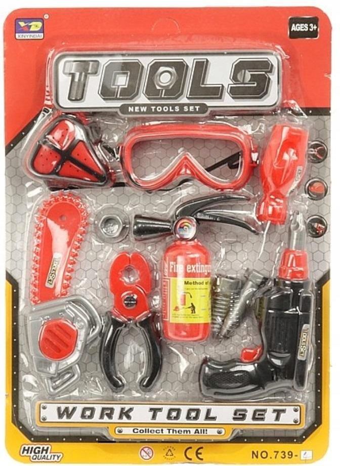 Zestaw kolorowych akcesoriów małego majsterkowicza. W zestawie mamy m. in.: młotek, klucz francuski i piłę. Wszystko to owinięte jest wokół pasa. W zestawie znajduje się także kask ochronny z imitacją latarki czołowej. Wszystko spakowane jest w worek z cienkiej siateczki. Produkt dostępny dla dzieci powyżej 3 lat. Wymiary: 202x753 mm Grupa wiekowa: 3+