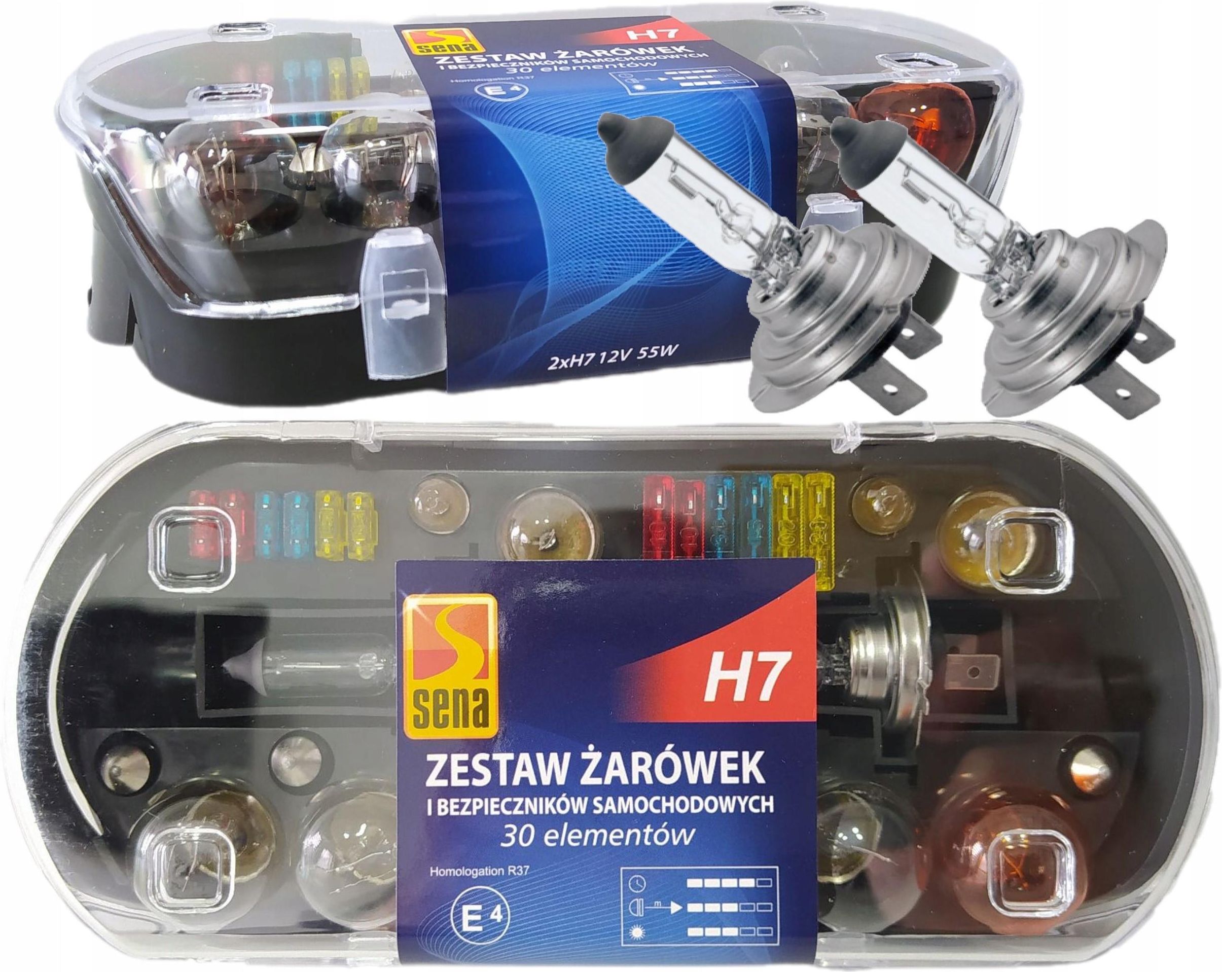Zestaw zasobnik komplet żarówek 2x H7 12V + Bezpieczniki - 30 Elementów 30-Elementowy zasobnik żarówek i bezpieczników od marki Sena, niezbędny w każdym samochodzie GŁÓWNYMI ŻARÓWKAMI TEGO ZESTAWU SĄ DWIE ŻARÓWKI TYPU H7 (12V, 55W, PX26d). W wielu krajach Europy posiadanie takiego zestawu jest wymagane prawnie, a brak karany jest mandatem. W Polsce posiadanie tego zestawu jest rekomendowane i za jego brak nie grozi mandat. Warto jednak posiadać taki zasobnik w schowku lub bagażniku, aby w razie spalenia się żarówki móc dokonać naprawy także "w trasie" (bo już za jazdę bez światła można mandat otrzymać). W SKŁAD ZESTAWU WCHODZĄ ŻARÓWKI 2x H7 12V 55W 3x P21/5W 12V 21/5W 2x P21W 12V 21W 1x PY21W 12V 21W 3x C5W 12V 5W T11x38 3x C10W 12V 10W T11x41 1x R5W 12V 5W 1x R10W 12V 10W BEZPIECZNIKI 2x 12V 4W, T4W 2x 10A 2x 15A 2x 20A 2x 10A (mini) 2x 15A (mini) 2x 20A (mini) Są to najpopularniejsze żarówki i bezpieczniki, jakie są stosowane w samochodach. Całość zamknięta jest w solidnym, praktycznym i wygodnym do przewożenia zasobniku. WYMIARY ZASOBNIKA długość: ok. 9 cm szerokość: ok. 19,5 cm wysokość: ok. 5,5 cm UWAGA Zestaw zapasowych żarówek jest zestawem uniwersalnym, dlatego też nie wszystkie zawarte w zasobniku żarówki i bezpieczniki muszą znaleźć zastosowanie w Twoim samochodzie. Przed dokonaniem zakupu upewnij się, jakie żarówki potrzebne są w Twoim pojeździe. Zdarza się bowiem, że producenci - nawet w obrębie jednego modelu i rocznika - stosowali różne żarówki (np. w Renault Clio II w oświetleniu głównym występowały żarówki H4, H7 lub D2S). Producent - SENA Firma SENA została założona w 1992 roku. Swoją działalność rozpoczęła od produkcji uniwersalnych pokrowców samochodowych, z czasem poszerzając asortyment o kolejne produkty. Obecnie SENA jest jednym z największych importerów i dystrybutorów akcesoriów motoryzacyjnych. W ofercie posiadają m. in. foteliki samochodowe, płyny eksploatacyjne, żarówki, wycieraczki, kompresory, prostowniki, odmrażacze, akcesoria do mycia i pielęgnacji aut, kołpaki, zapachy samochodowe, kanistry. Produkty marki SENA cechuje innowacyjność rozwiązań, wysoki standard wykonania oraz trwałość i jakość. Od początku istnienia firma sukcesywnie zdobywała rynek krajowy i zagraniczny. Aktualnie artykuły są eksportowane do wielu krajów m.in. Austrii, Belgii, Czech, Dubaju, Finlandii, Francji, Grecji, Hiszpanii, Holandii, Niemiec, Portugalii, Rosji, Szwajcarii, czy Włoch.