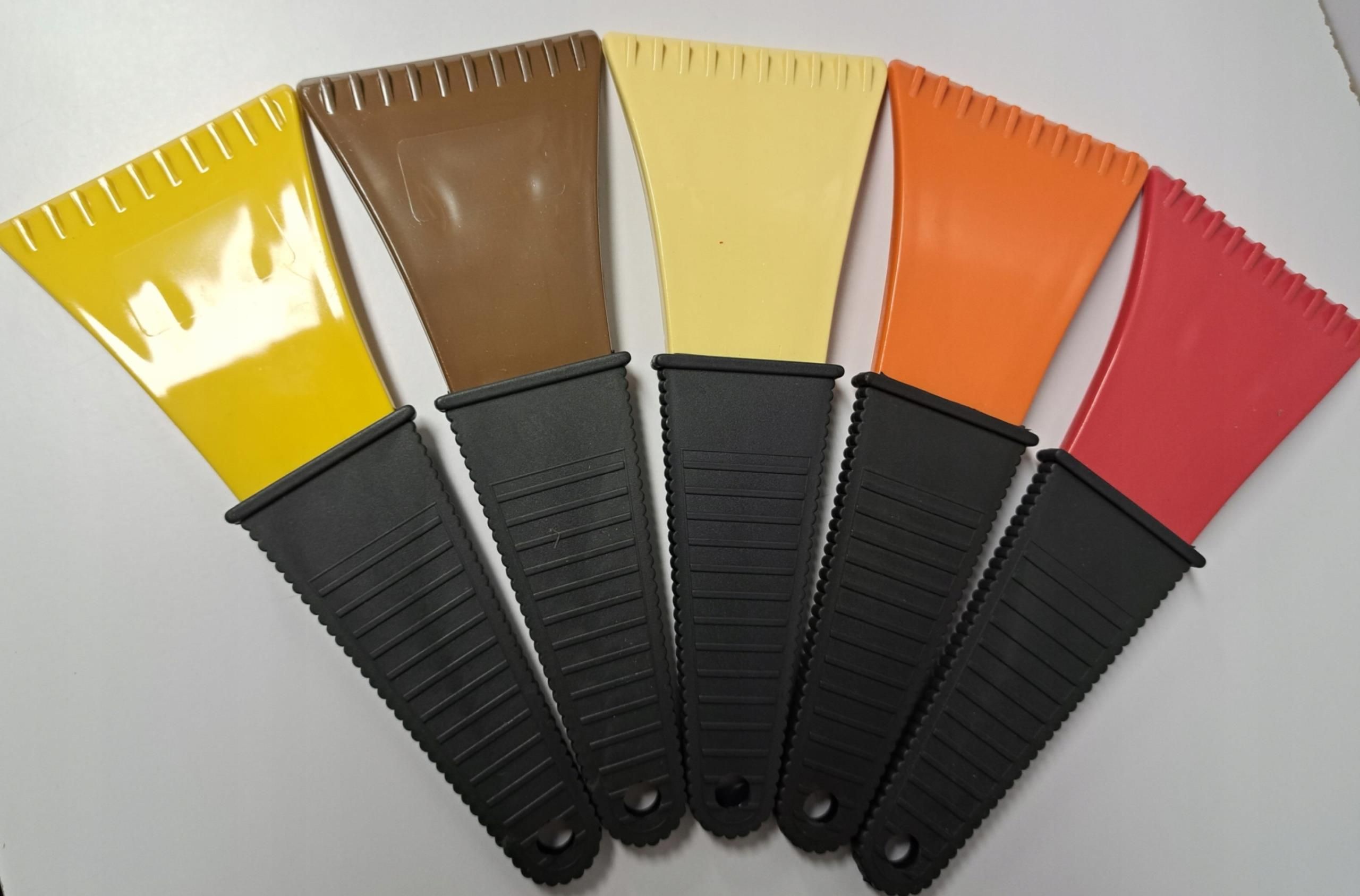 Skrobaczki do szyb komplet 4 szt. Praktyczna - dwu częściowa skrobaczka wykonana z wysokoudarowego POLISTYRENU - skrobak zapewnia bezpieczne usuwanie szronu, lodu, śniegu z powierzchni szyby bez możliwości jakiegokolwiek zadrapania powierzchni, RĄCZKA - rękojeść wykonana z polipropylenu, ergonomiczny kształt wraz z poprzecznymi, wystającymi liniami daje komfort uchwytu tak gołą dłonią jak też osłonięta rękawiczką, otwór na końcu rękojeści pozwala zawiesić skrobaczkę na haczyku. kolorystyka: RĄCZKA - czarny, skrobak mix kolor. Dostępne kolory : musztardowy, niebieski, fioletowy, różowy, żółty, czerwony, pomarańczowy, zielony, brązowy, czarny. Wymiary długość - 23 cm szerokość - 9 cm długość skrobaka - 10 cm długość rączki - 13 cm szerokość rączki - 5 cm średnica otworu rączki - 0,9 cm Przy zakupie proszę w wiadomości do sprzedającego o podanie koloru skrobaczek czy skrobaczki mają być w jednolitym kolorze czy dwa różne kolory w razie braku informacji towar zostanie wysłany losowo.