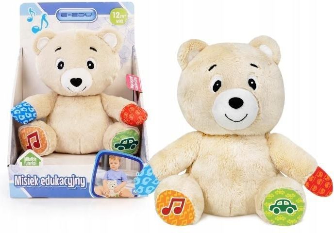 ARTYK Miś pluszowy interaktywny E-Edu Miś Pluszowy Interaktywny E-Edu to niezwykły pluszak, który po naciśnięciu na prawą nóżkę odtwarza aż 6 uroczych piosenek, które na pewno rozświetlą każdy dzień Twojego dziecka. A to jeszcze nie koniec! Po naciśnięciu na lewą nóżkę, miś recytuje wierszyki i krótkie frazy o onomatopejach. Dodatkowo wydaje dźwięki, co sprawia, że staje się jeszcze bardziej interaktywny i atrakcyjny dla maluchów. Miś został stworzony z myślą o najmłodszych, dlatego też jest bezpieczny dla dzieci już od 12 miesiąca życia. Wykonany jest z miękkiego pluszu, co sprawia, że jest przyjemny w dotyku i doskonały do przytulania. Ponadto, jego kolorowy design z pewnością przyciągnie uwagę zarówno chłopców, jak i dziewczynek. Baterie demonstracyjne są dołączone w zestawie, dzięki czemu od razu po wyjęciu z opakowania można cieszyć się interaktywnymi funkcjami misia. Miś ma kompaktowe wymiary, jego wysokość wynosi 20 cm, co sprawia, że idealnie mieści się w małych rączkach dziecka. To doskonały towarzysz zabaw zarówno w domu, jak i w podróży. Nr katalogowy: 174155 Marka: E-Edu Rodzaj: Misie Wymagania wiekowe: 12 miesięcy Materiał: Plusz Płeć: Chłopcy,Dziewczynki Kolor: Wielokolorowy Produkt na baterie: Tak Baterie w zestawie: Tak Zasilanie : Baterie/akumulatory AAA Wysokość: 20 cm Pozostałe parametry: Wymiary opakowania: 20 x 29 x 15 cm Bezpieczeństwo: Należy zdjąć opakowanie przed oddaniem zabawki do rąk dziecka. Opakowanie nie służy do zabawy. Należy zachować opakowanie/ulotkę/etykietę, gdyż zawiera ważne informacje. Zdjęcie ma charakter poglądowy, produkt może nieznacznie różnić się od prezentowanego na fotografii. Wyprodukowano w ChRL. CZYSZCZENIE: W razie zabrudzeń czyścić suchą, miękką ściereczką. BEZPIECZNE UŻYTKOWANIE BATERII: Nie należy mieszać ze sobą różnych typów baterii lub nowych i używanych baterii. Nie mieszać jednocześnie baterii alkalicznych, standardowych (węglowo-cynkowych) oraz baterii nadających się do powtórnego ładowania. Nie należy powtórnie ładować baterii nie przeznaczonych do powtórnego ładowania. Baterie przewidziane do ładowania mogą być ładowane jedynie pod nadzorem dorosłych. Baterie przewidziane do ładowania należy przed ładowaniem wyjąć z zabawki. Baterie należy wkładać z zachowaniem prawidłowej biegunowości (+ i -). Umieścić baterie zgodnie z rysunkiem na opakowaniu. Wyczerpane baterie należy wyjąć z zabawki. W czasie gdy zabawka nie jest używana należy wyjąć baterie. Nie wrzucać zużytych baterii do ognia. Należy wyłączyć produkt przed włożeniem baterii. Nie doprowadzać do zwarcia w komorze na baterie. Trzymać baterie z dala od dzieci. Chronić przed kontaktem z wodą. Montaż/demontaż baterii może być wykonany wyłącznie przez osoby dorosłe. Nie należy demontować części składowych zabawki. Nie wolno zwierać zacisków zasilania. Proszę zachować bezpieczeństwo podczas wyjmowania/wymiany baterii. Wyłącz produkt przed wyjęciem/wymianą baterii. Odkręć śruby lub/i podważ wieczko, usuń bezpiecznie baterie.