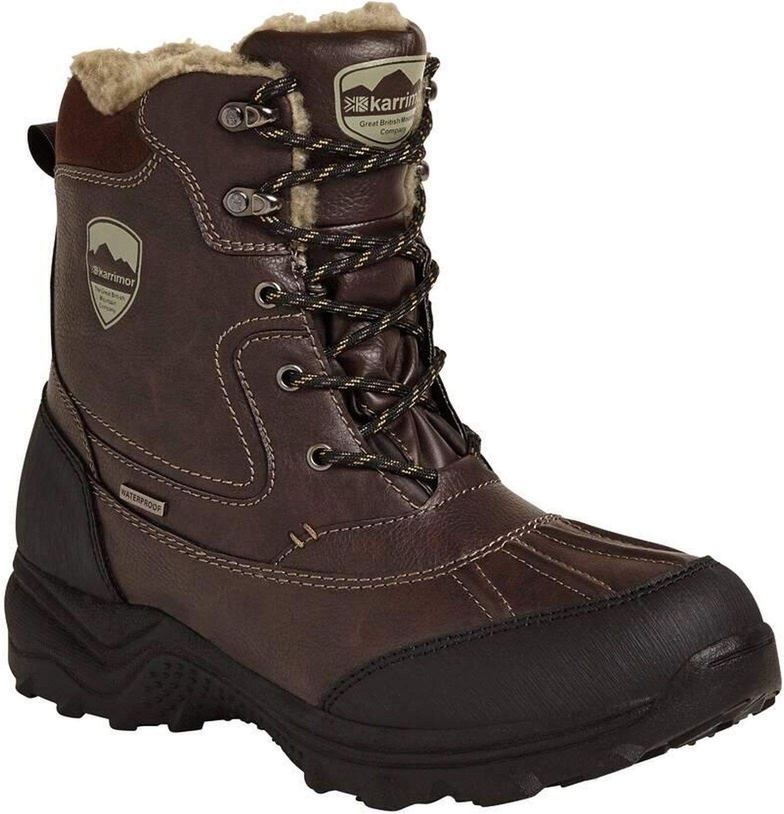 Męskie buty ocieplane zimowe KARRIMOR Snow Casual K815-BRN R. 45 BUTY KARRIMOR SNOW CASUAL K815-BRN Męskie obuwie zimowe Materiał: skóra naturalna, wełna Membrana Weathertite Wyściółka z krótkiego futerka, wełnianie ocieplenie Kolor: brązowy Rozmiar 45 Długość wkładki: 29,5 cm Buty zimowe KARRIMOR Snow Casual to wygodne obuwie outdoorowe, sprawdzi się zarówno do użytku codziennego, jak i na lekkie trasy górskie. Profilowana podeszwa z wypustkami charakteryzuje się dużą przyczepnością na nierównym i śliskim podłożu oraz trwałością. Obuwie posiadają technologię WEATHERTITE, czyli oddychającą warstwę pozwalającą na odprowadzanie wilgoci z buta oraz warstwę wiatro- i wodoodpornej membrany.