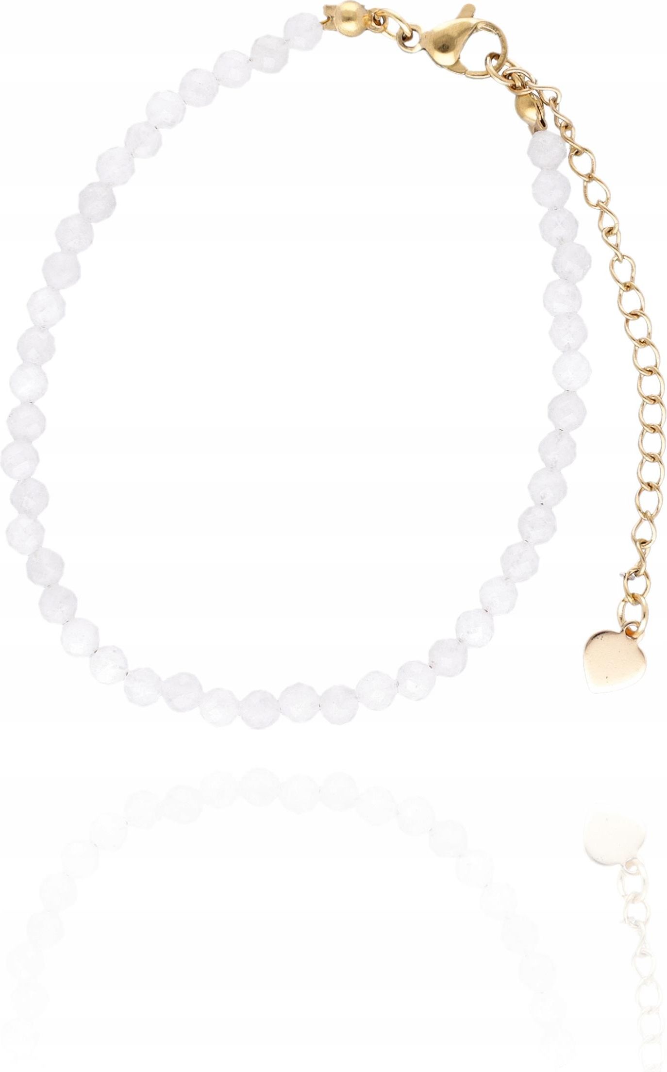 Bransoletka z Jadeitu Delikatna Bransoletka z Kamieniami Naturalnymi Bransoletka z Kamieniem Jadeit Specyfikacja Kamień: jadeit Długość: około 17 cm + 5 cm regulacji Koralik: 3-4 mm Kolor: złoty, biały Zapięcie: klasyczne, z regulacją Materiał: kamień, stal szlachetna pozłacana Każda bransoletka jest unikatowa. Zdjęcia przedstawiają przykładowe bransoletki. Bransoletka wysyłana losowo. Opakowanie: ozdobna tekturka biżuteryjna. Biała Bransoletka z Kamieniami Cechy Kamienie naturalne: fasetowane kamienie naturalne. Kolorystyka: półprzezroczyste oraz mleczne i szarawe biele. Zapięcie: klasyczne zapięcie typu karabińczyk w kolorze złotym. Regulacja długości: łańcuszek przedłużający z zawieszką w kształcie serca. Styl: delikatny, minimalistyczny, kobiecy. Zalety Uniwersalna: pasuje do różnych stylizacji – zarówno codziennych, jak i eleganckich. Właściwości kamienia: jadeit jest ceniony za swoje właściwości energetyczne i piękny kolor. Regulowana długość: możliwość dopasowania do różnych rozmiarów nadgarstka. Zawieszka serce: dodaje uroku i subtelnego, romantycznego akcentu. Fasetowane kamienie: efektownie odbijają światło, co nadaje trójwymiarowości i blasku. Bransoletka z Kamieniem Naturalnym Jadeit biały Wnosi spokój i harmonię – łagodzi napięcia emocjonalne, wycisza umysł i sprzyja wewnętrznemu balansowi. Wzmacnia czystość intencji – pomaga działać z poziomu serca i zachować uczciwość wobec siebie i innych. Sprzyja duchowemu wzrostowi – wspomaga rozwój świadomości, intuicji i połączenie z wyższą mądrością. Chroni energetycznie – uznawany za kamień ochronny, który tworzy tarczę przed negatywnymi wpływami. Wzmacnia cierpliwość i tolerancję – pomaga w zachowaniu spokoju w relacjach i trudnych sytuacjach. Przyciąga dobrobyt i szczęście – w tradycjach Wschodu jadeit uważany jest za kamień pomyślności i powodzenia.
