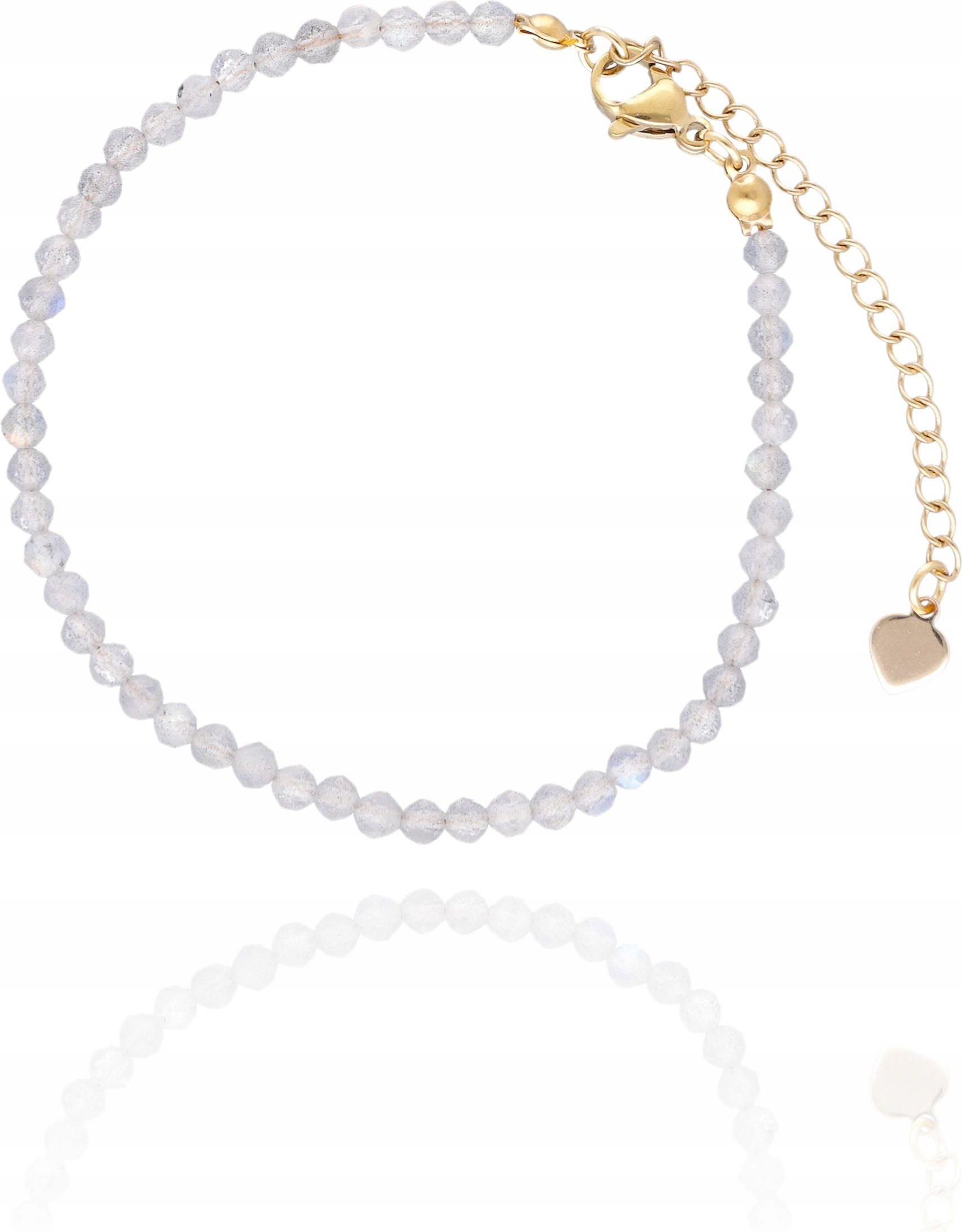 Bransoletka z Labradorytem Delikatna Bransoletka z Kamieniami Naturalnymi Bransoletka z Kamieniem Labradoryt Specyfikacja Kamień: labradoryt Długość: około 17 cm + 5 cm regulacji Koralik: 3-4 mm Kolor: złoty, szary, przezroczysty, z połyskiem Zapięcie: klasyczne, z regulacją Materiał: kamień, stal szlachetna pozłacana Każda bransoletka jest unikatowa. Zdjęcia przedstawiają przykładowe bransoletki. Bransoletka wysyłana losowo. Opakowanie: ozdobna tekturka biżuteryjna. Delikatna Bransoletka z Kamieniami Cechy Kamienie naturalne: fasetowane kamienie naturalne. Kolorystyka: subtelne szarości, przezroczystości, migotliwy połysk. Zapięcie: klasyczne zapięcie typu karabińczyk w kolorze złotym. Regulacja długości: łańcuszek przedłużający z zawieszką w kształcie serca. Styl: delikatny, minimalistyczny, kobiecy. Zalety Uniwersalna: pasuje do różnych stylizacji – zarówno codziennych, jak i eleganckich. Właściwości kamienia: labradoryt jest ceniony za swoje właściwości energetyczne i efekt labradoryzacji (połysku). Regulowana długość: możliwość dopasowania do różnych rozmiarów nadgarstka. Zawieszka serce: dodaje uroku i subtelnego, romantycznego akcentu. Fasetowane kamienie: efektownie odbijają światło, co nadaje trójwymiarowości i blasku. Bransoletka z Kamieniem Naturalnym Labradoryt Kojarzony z duchowym przebudzeniem, transformacją i ochroną. Magiczny i tajemniczy kamień łączący właściciela ze sferą duchową. Odblokowuje wewnętrzną mądrość, wzmacnia intuicję i zdolności psychiczne. Nosi miano „kamienia transformacji (przemiany)”, który zachęca do osobistego rozwoju oraz podejmowania odważnych decyzji prowadzących ku dobrej zmianie. Wyzwala twórczość, wspiera artystyczne dusze. Rozwija wyobraźnię, rozbudza entuzjazm i innowacyjne pomysły.