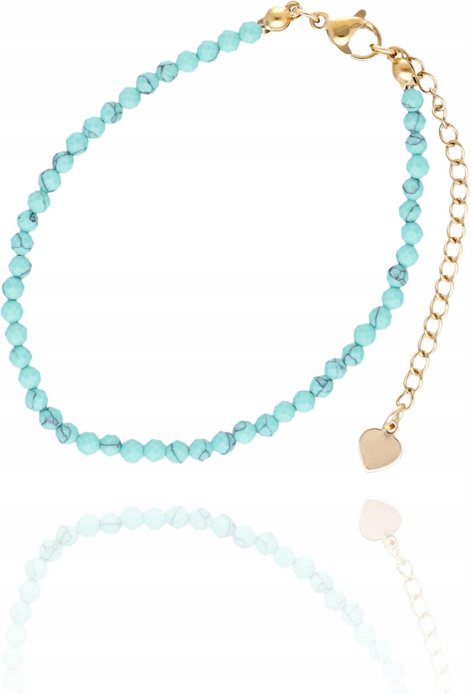Bransoletka z Turkmenitu Delikatna Bransoletka z Kamieniami Naturalnymi Bransoletka z Kamieniem Turkmenit Specyfikacja Kamień: turkmenit (howlit barwiony na niebiesko) Długość: około 17 cm + 5 cm regulacji Koralik: 3-4 mm Kolor: złoty, niebieski, szary Zapięcie: klasyczne, z regulacją Materiał: kamień, stal szlachetna pozłacana Każda bransoletka jest unikatowa. Zdjęcia przedstawiają przykładowe bransoletki. Bransoletka wysyłana losowo. Opakowanie: ozdobna tekturka biżuteryjna. Niebieska Bransoletka z Kamieniami Cechy Kamienie naturalne: fasetowane kamienie naturalne. Kolorystyka: odcienie niebieskiego, przeplatane szarymi żyłkami. Zapięcie: klasyczne zapięcie typu karabińczyk w kolorze złotym. Regulacja długości: łańcuszek przedłużający z zawieszką w kształcie serca. Styl: delikatny, minimalistyczny, kobiecy. Zalety Uniwersalna: pasuje do różnych stylizacji – zarówno codziennych, jak i eleganckich. Właściwości kamienia: howlit jest ceniony za swoje właściwości energetyczne przynoszące spokój. Regulowana długość: możliwość dopasowania do różnych rozmiarów nadgarstka. Zawieszka serce: dodaje uroku i subtelnego, romantycznego akcentu. Fasetowane kamienie: efektownie odbijają światło, co nadaje trójwymiarowości i blasku. Bransoletka z Kamieniem Naturalnym Turkmenit Turkmenit to powszechnie używana nazwa dla barwionego howlitu, który po barwieniu ma przypominać turkus. Howlit, będący minerałem o naturalnie białej lub szarawo-białej barwie z delikatnymi, szarymi żyłkami, jest porowaty i łatwo poddaje się procesowi barwienia. Dzięki temu można mu nadać niebieski lub zielonkawy kolor, który do złudzenia przypomina naturalny turkus. Jest kamieniem spokoju, pomagającym w redukcji stresu i napięcia, oraz wspiera rozwój cierpliwości i komunikacji.