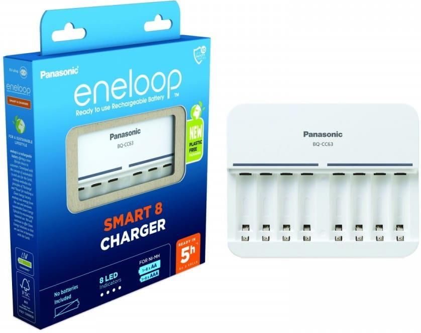 ENELOOP BQ-CC63E ERP ŁADOWARKA PANASONIC SMART 8Ładowarka Panasonic Eneloop BQ-CC63E ERP to inteligentne urządzenie przeznaczone do ładowania akumulatorów Ni-MH (niklowo-metalowo-wodorkowych) typu AA oraz AAA. Może ładować jednocześnie od 1 do 8 ogniw, co czyni ją idealnym wyborem dla osób często korzystających z dużej liczby akumulatorów, np. w aparatach fotograficznych, kontrolerach do gier, latarkach czy innych urządzeniach domowych. Co więcej, każdy z ośmiu slotów ma własną diodę LED, która informuje o stanie naładowania. Dzięki zastosowaniu technologii Smart Charge, ładowarka monitoruje napięcie i temperaturę każdego akumulatora osobno, co zapobiega ich przeładowaniu i wydłuża ich żywotność. DeltaV w ładowarce automatycznie wykrywa napięcie i kończy ładowanie zaraz po przepełnieniu. Ładowanie aż do 8 akumulatorów jednocześnie Inteligentna ładowarka Eneloop Panasonic Smart 8 jest idealna dla wymagających użytkowników i ładuje od 1 do 8 akumulatorów Ni-MH w rozmiarze AA (Mignon) lub AAA (Micro). Funkcja Individual Charge Control umożliwia ładowanie dowolnej kombinacji do ośmiu akumulatorów AA/AAA, nawet pojedynczych akumulatorów lub ich mieszanki o różnych pojemnościach. Dzięki tej elastyczności można ładować zarówno pojedyncze ogniwa, jak i większe zestawy, co czyni ją doskonałym wyborem dla osób korzystających z wielu urządzeń na akumulatory, takich jak aparaty fotograficzne, latarki, kontrolery do gier czy piloty zdalnego sterowania. Inteligentny system kontroli ładowania (Smart Charge) Ładowarka Panasonic Eneloop BQ-CC63E ERP została wyposażona w inteligentny system kontroli ładowania Smart Charge, który nie tylko optymalizuje proces ładowania, ale także chroni akumulatory przed uszkodzeniami i przedłuża ich żywotność. Zaawansowany mikroprocesor dba o optymalizację ładowania, zapobiega przegrzewaniu i przeładowaniu, co zwiększa żywotność akumulatorów. Ochrona DeltaV Aby zapewnić szczególnie delikatne ładowanie, szybka ładowarka jest wyposażona w zaawansowaną ochronę przed przeładowaniem, które chroni akumulatory. Każde ogniwo ładowane jest indywidualnie. Funkcja Minus Delta V Control wykrywa, kiedy akumulator jest pełny i wyłącza poszczególne gniazda tuż po przepełnieniu akumulatora, aby zapobiec przeładowaniu. Obsługa napięcia 100-240V Ładowarka może być używana na całym świecie, ponieważ obsługuje różne standardy napięcia (100–240 V/50–60 Hz). Jest także idealnym rozwiązaniem do użytkowania w biurze lub podczas wydarzeń, gdy konieczne jest ładowanie wielu akumulatorów jednocześnie. Wskaźnik LED sygnalizujący stan baterii Oddzielne diody LED nad każdym gniazdem świecą na zielono, wskazując, że trwa ładowanie. Co więcej, ładowarka automatycznie sprawdza, czy zainstalowane akumulatory mogą być ładowane. Jeśli akumulator zostanie włożony nieprawidłowo lub zostanie zainstalowana bateria jednorazowa, dioda nad danym slotem zacznie migać na zielono, a zasilanie tego slotu zostanie odcięte w celu zapewnienia bezpieczeństwa. Bezpieczeństwo i ekologia Funkcja automatycznego odcięcia prądu po pełnym naładowaniu akumulatorów Ochrona przed przegrzaniem i zwarciem Ekologiczne opakowanie wykonane z materiałów nadających się do recyklingu Testy wewnętrzne IEC 61951-2(7.3.2.) - różni się w zależności od warunków użytkowania Zawartość opakowania Ładowarka Kabel AC Instrukcja obsługi Uwaga! Zestaw nie zawiera baterii. Pojemności baterii oraz czas ich ładowania AA: 2400 - 2550 mAh: 6 godzin 1900 - 2000 mAh: 5 godzin 950 - 1000 mAh: 2.5 godziny AAA: 900 - 950 mAh: 3.5 godziny 750 - 800 mAh: 3 godziny 550 - 650 mAh: 2.5 godziny Dane techniczne Model: Panasonic Eneloop BQ-CC63E ERP Typ obsługiwanych akumulatorów: AA / AAA Ni-MH Ilość slotów ładowania: 8 Niezależne kanały ładowania: Tak Napięcie wejściowe: AC 100-240V / 50/60Hz, 0.3 A Prąd ładowania (dla AA): 1.5 v x 8 = ; 1.2 A max ; (średnio 500 mA) Prąd ładowania (dla AAA): 1.5 v x 8 = ; 1.2 A max ; (średnio 300 mA) System kontroli ładowania: Smart Charge Wskaźniki ładowania: Dioda LED dla każdego akumulatora Wymiary: 147 x 119 x 28 mm Waga: ~ 240 g (bez kabla)