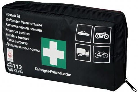 Wyposażenie zgodne z normą unijną DIN13164 + ustnik: zestaw plastrów (14 szt.) plaster na szpulce 5 m x 2,5 cm (1 szt.) bandaż elastyczny 4 m x 6 cm (2 szt.) bandaż elastyczny 4 m x 8 cm (3 szt.) rękawiczki winylowe (2 pary) chusteczki nasączone (2 szt.) chusta opatrunkowa 60x80 cm (1 szt.) chusta opatrunkowa 60x40 cm (1 szt.) bandaż z kompresem (opatrunek indywidualny) 6x8 cm (1 szt.) bandaż z kompresem (opatrunek indywidualny) 8x10 cm (2 szt.) bandaż z kompresem (opatrunek indywidualny) 10x12 cm (1 szt.) kompres na rany 10x10 cm (6 szt.) ustnik do sztucznego oddychania chusta trójkątna 96x96x136 cm (2 szt.) koc termiczny 160x210 cm (1 szt.) nożyczki 14,5 cm (1 szt.) instrukcja udzielania pierwszej pomocy Ważność apteczki ok. 5 lat wymiary apteczki: 240 x 140 x 60 mm wykonanie: tkanina wodoodporna, kolor czarny wyposażenie wyprodukowano zgodnie z normami UE Apteczka jest obowiązkowym wyposażeniem samochodu w krajach Unii Europejskiej m.in. (Niemcy, Czechy, Austria, Francja, Holandia, Litwa ) Wszystkie produkty w apteczce posiadają znak