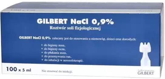 Co to jest sól fizjologiczna Gilbert 0,9% NaCl? Gilbert NaCl 0,9% to wyrób medyczny w postaci roztworu soli fizjologicznej, czyli izotonicznego roztworu wody i chlorku sodu. Opakowanie zawiera 100 ampułek, z której każda cechuje się sterylnością. Sól fizjologiczną Gilbert NaCl 0,9% można stosować do przemywania oczu i uszu, a także do oczyszczania ran. Ampułki są również używane do nebulizacji zalecanej szczególnie podczas przeziębienia i chorób górnych dróg oddechowych. Sól fizjologiczna stosowana jako pojedynczy składnik nebulizacji nawilża układ oddechowy, może być również mieszana z większością wziewnych leków do nebulizacji. Ampułki Gilbert NaCl są przeznaczone dla niemowląt od 1. dnia życia, starszych dzieci i dorosłych. Ze względu na bezpieczny skład produkt można używać nawet kilka razy dziennie. Należy jednak pamiętać, że po otwarciu ampułki sól fizjologiczna może ulec zanieczyszczeniu, dlatego trzeba ją zużyć jak najszybciej. Ampułek Gilbert NaCl 0,9% nie wolno stosować w zastrzykach.
