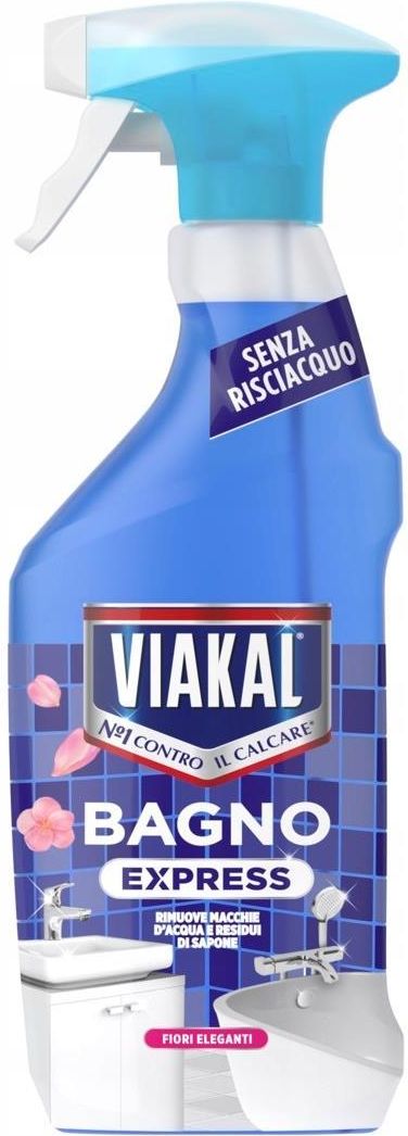 Viakal Bagno Express Fiori Eleganti płyn do mycia łazienki w sprayu (470ml) Viakal Bagno Express Fiori Eleganti płyn do mycia łazienki w sprayu (470ml) Chcesz mieć łazienkę, która jest zawsze czysta i lśniąca? W takim razie wypróbuj spray do łazienek Bagno Express firmy Viakal! Jego silna formuła skutecznie usuwa plamy z wody i pozostałości mydła ze wszystkich powierzchni łazienkowych, bez konieczności spłukiwania. Idealny do codziennego stosowania na urządzeniach sanitarnych, chromie i płytkach, spray do kąpieli Viakal nada Twojej łazience przyjemny kwiatowy zapach, zapewniając jeszcze pełniejsze uczucie czystości. Viakal to nie tylko skuteczność, ale także komfort oraz przyjemność użycia. Dzięki niemu codzienne czyszczenie łazienki staje się szybsze i bardziej efektywne, pozostawiając świeży zapach i błysk na każdej powierzchni. Jego wszechstronne zastosowanie sprawia, że idealnie nadaje się do regularnego użytku, zapewniając długotrwałe uczucie czystości oraz świeżości. UWAGA! Nieć stosować do czyszczenia plastiku, złota, srebra miedzi i aluminium INSTRUKCJA OBSŁUGI Przekręć nakrętkę zabezpieczjącą Spryskaj czyszczone miejsce Viakal Bagno Spray. Pozwól Viakalowi uporać się z brudem w 5 min! Wilgotną gąbką wytrzyj wcześniej spryskaną powierzchnię i?.. ciesz się czystością. 100% ORYGINALNE Wszystkie produkty oferowane na naszych aukcjach są przez nas importowane bezpośrednio z Włoch Są to produkty oryginalne, przeznaczone na rynek włoski