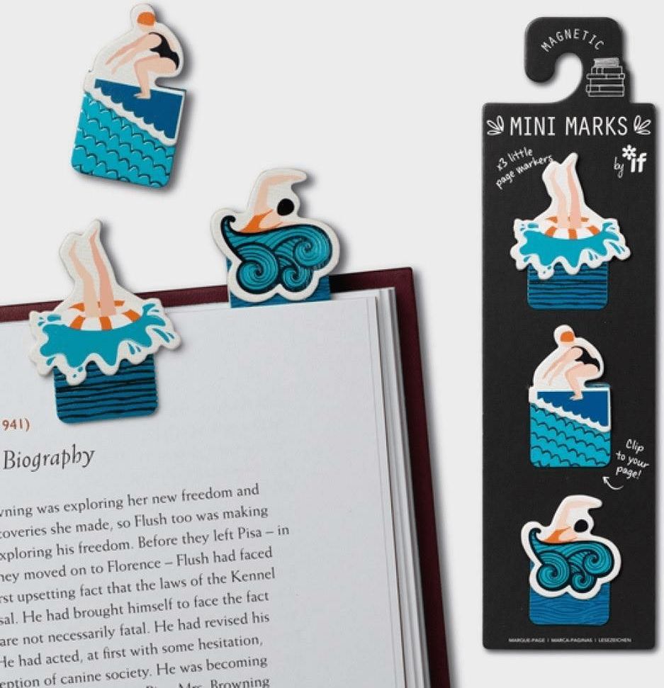 Zakładki magnetyczne Mini Marks Pływanie 3 szt. IF Zestaw 3 magnetycznych mini zakładek. Zaprojektowane tak, aby przyczepiały się do kartek papieru, bez szkody dla książki. Doskonała jakość wykonania i dbałość o najmniejsze detale. Aż chce się czytać! Świetny prezent dla każdego miłośnika książek. …