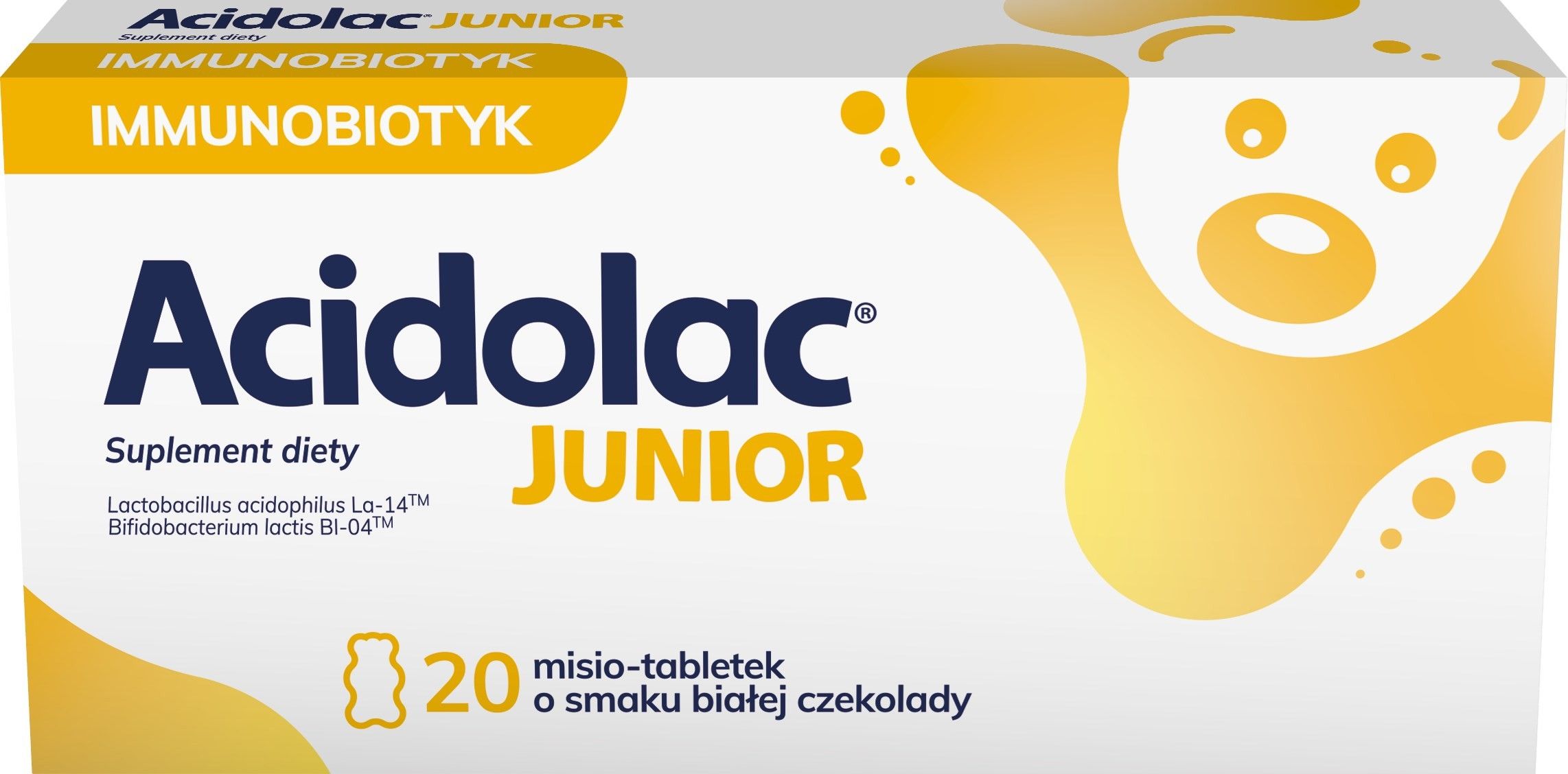 Acidolac Junior - suplement diety zawierający w składzie szczepy bakterii Lactobacillus acidophilus oraz Bifidobacterium lactis. Produkt przeznaczony dla dzieci powyżej 3 roku życia i osób dorosłych. 20 misio-tabletek o smaku białej czekolady Składniki substancja słodząca maltitol; olej palmowy; …