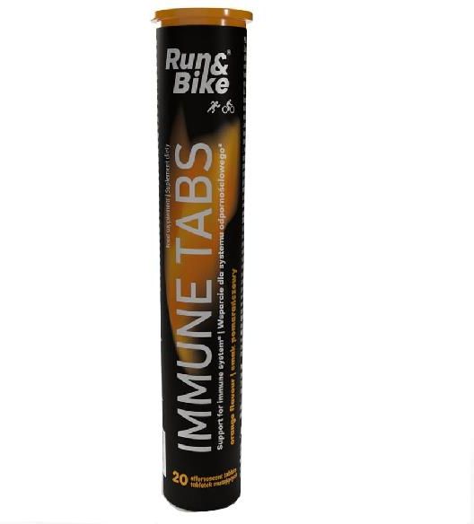 ACTIVLAB Run&Bike immune Tabs Tuba 20 tab Immune Tabs o smaku pomarańczowym to tabletki, które wspierają działanie układu immunologicznego oraz zwalczają wolne rodniki, które powstają np. podczas treningu. Witaminy C jest również potrzebna do regeneracji obciążonych stawów sportowca. Cynk jest ważnym mikroelementem biorącym udział między innymi w procesie metabolizmu makroskładników. Dodatkowo produkt został wzbogacony w ekstrakt z czarnego bzu, który ma właściwości antyoksydacyjne oraz ekstrakt z jeżówki purpurowej, która jest naturalnym środkiem zapobiegającym przeziębieniu. Suplement dedykowany jest przed wszystkim sportowcom i osobom o obniżonej odporności. Właściwości produktu wspiera prawidłowe funkcjonowanie układu odpornościowego ma pozytywny wpływ na sportową formę bierze udział walce z rodnymi rodnikami chroni komórki przed stresem oksydacyjnym Składniki1 tabletkaWitamina C1000 mgCynk15 mgWitamina D50 µgEkstrakt z czarnego bzu150 mgEkstrakt z jeżówki purpurowej100 mg Inne składniki: Kwas L-askorbinowy, regulatory kwasowości: kwas cytrynowy i węglany sodu, substancja wypełniająca: sorbitole, ekstrakt z owoców czarnego bzu (Sambucus nigra), aromat, ekstrakt z ziela jeżówki purpurowej (Echinacea purpurea), diglicynian cynku, substancja przeciwzbrylająca: glikol polietylenowy, barwniki: karoteny i ryboflawiny, substancja słodząca: sukraloza, cholekalcyferol. Sposób użycia 1 tabletkę rozpuścić w 200 ml wody. Stosować raz dziennie. Opakowanie: 20 tabletek Porcja: 1 tabletka Liczba porcji w opakowaniu: 20 Przeciwwskazania Nie zaleca się stosowania przez kobiety w ciąży, matki karmiące piersią oraz osoby uczulone na którykolwiek ze składników produktu. Suplement diety nie może być substytutem (zamiennikiem) zdrowego trybu życia. Nie przekraczać zalecanej dziennej dawki. Przechowywanie Przechowywać w suchym i ciemnym miejscu niedostępnym dla małych dzieci.