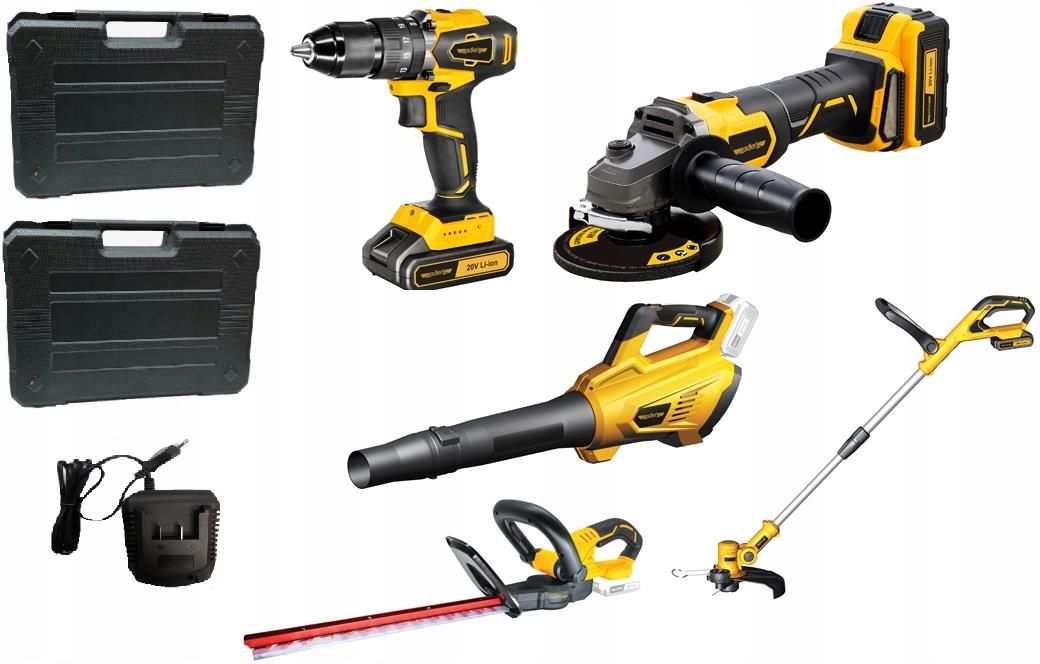 ZESTAW NARZĘDZI AKUMULATOROWYCH : - Wiertarka udarowa AKU-1700W - Szlifierka kątowa AKU-125S - Nożyce do żywopłotu AKU-1400N - Dmuchawa do liści AKU-18000D - Podkaszarka do trawy AKU-8500K AKU-1700W Akumulatorowa wiertarka udarowa ADLER Wiertarka AKU-1700W posiada silnik bezszczotkowy zapewniający do 25% większy moment obrotowy niż w silniku szczotkowym. Posiada przy tym czterokrotnie większą żywotność oraz dwukrotnie większą wydajność. Wiertarka pracuje z akumulatorem 20V zapewniającym znacznie większą moc niż 18 czy 12V odpowiedniki. Posiada dwubiegową przekładnię, 21 ustawień siły momentu obrotowego oraz 3 funkcje: wiercenia, wkręcania, wiercenia z udarem. Urządzenie posiada elektroniczny hamulec, latarkę LED oświetlającą miejsce pracy, ergonomiczną dobrze wyprofilowaną rękojeść. Dane techniczne: Kod towaru: 3410.2 Bateria: 20V Li-ion 2 Ah Średnica uchwytu wiertła: 13 mm Typ uchwytu: samozaciskowy Maksymalny moment obrotowy: 45 Nm Przekładnia: dwubiegowa Obroty bez obciążenia: 0-450 rpm / 0-1700 rpm Ilość uderzeń udaru: 0-25500 bpm Ilość ustawień momentu obrotowego: 21 Tryby pracy: wkręcanie / wiercenie / wiercenie z udarem Maksymalna średnica otworu w: drewnie 38 mm, metalu 10 mm, betonie 13 mm Waga netto: 1,1 kg Waga brutto: 3,1 kg AKU-125S Akumulatorowa szlifierka kątowa ADLER Szlifierka kątowa AKU-125S posiada silnik bezszczotkowy zapewniający do 25% większy moment obrotowy niż w silniku szczotkowym. Posiada przy tym czterokrotnie większą żywotność oraz dwukrotnie większą wydajność. Szlifierka pracuje z akumulatorem 20V zapewniającym znacznie większą moc niż 18 czy 12V odpowiedniki. Urządzenie posiada ergonomiczną dobrze wyprofilowaną rękojeść oraz dodatkową boczną rekojeść, którą można zamontować z obu stron szlifierki. Przycisk blokady wrzeciona, beznarzędziowe ustawienie osłony tarczy oraz funkcja łagodnego startu ułatwia obsługę i pracę szlifierką. Dane techniczne: Kod towaru: 3410.8 Bateria: 20V Li-ion 4 Ah Średnica tarczy: 125 mm Średnica wrzeciona: M14 Maksymalna grubość tarczy: 6 mm Obroty bez obciążenia: 8500 rpm (rpm ~round per minute) Waga netto: 1,6 kg Waga brutto: 4,2 kg AKU-1400N Akumulatorowe nożyce do żywopłotu Adler Nożyce pracują z akumulatorem 20V zapewniającym znacznie większą moc niż 18 czy 12V odpowiedniki. Urządzenie posiada regulowany przedni uchwyt pełniący rolę dodatkowego włącznika. Dane techniczne: Kod towaru: 3305.2 Napięcie: 20V Prędkość skokowa: 1400 spm Długość szyny tnącej: 51 cm Średnica cięcia: 17 mm Waga netto: 2,5 kg AKU-18000D Akumulatorowa dmuchawa do liści Adler Dmuchawa do liści pracuje z akumulatorem 20V zapewniającym znacznie większą moc niż 18 czy 12V odpowiedniki. Dmuchawa posiada dwustopniową regulację prędkości. Dane techniczne: Kod towaru: 3305.6 Bateria: 20V Li-ion 4 Ah Prędkość powietrza: 45 m/s Przepływ powietrza: 11 m3/min Waga netto: 2,5 kg AKU-8500K Akumulatorowa podkaszarka do trawy Adler Podkaszarka pracuje z akumulatorem 20V zapewniającym znacznie większą moc niż 18 czy 12V odpowiedniki. Urządzenie można w znacznym stopniu dopasować do każdego użytkownika dzięki możliwej regulacji: nachylenia głowicy koszącej, nachylenia uchwytu oraz długości trzonka podkaszarki. Akumulator posiada wskaźnik naładowania. Podkaszarka wyposażona w ogranicznik linii cięcia, umożliwia także pionowe wycinanie krawędzi. Dane techniczne: Kod towaru: 3408.4 Bateria: 20V Li-ion 4 Ah Prędkość obrotowa: 8500 r.p.m. Średnica koszenia: 30 cm Średnica żyłki: 1,65 mm Waga netto: 2 kg* Waga brutto: 3,2 kg** Kupując otrzymujesz: 1 x Wiertarka udarowa AKU-1700W + walizka 1 x Szlifierka kątowa AKU-125S + walizka 1 x Nożyce do żywopłotu AKU-1400N 1 x Dmuchawa do liści AKU-18000D 1 x Podkaszarka do trawy AKU-8500K 1 x Akumulator 2 Ah 1 x Akumulator 4 Ah 1 x Ładowarka