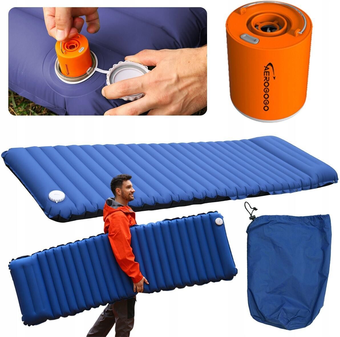 MATERAC z pompką automatycznie dmuchany AEROGOGO GM4-01 1 osobowy na biwak Aerogogo AeromattressGM4-01 to doskonały wybór dla osób szukających wygodnego, uniwersalnego i trwałego materaca dmuchanego. Dzięki swoim licznym zaletom, ten materac zapewni Ci komfort i relaks w każdej sytuacji. Dzięki innowacyjnej konstrukcji i wysokiej jakości materiałom, zapewnia wyjątkowy komfort podczas snu. Zapewniana optymalne wsparcie dla kręgosłupa. Idealny do użytku zarówno w domu, jak i na wyjazdach. Możesz go używać na kempingu, podczas podróży czy nawet jako dodatkowe miejsce do spania dla gości. Pompkę można odłączyć od materaca i wykorzystać do pompowania innych przedmiotów, takich jak materace powietrzne czy zabawki. Materac można napompować w zaledwie 70 sekund. Po złożeniu materac zajmuje niewiele miejsca, co ułatwia jego transport i przechowywanie. Proces opróżniania materaca z powietrza zajmuje zaledwie około 60 sekund. Materac ma 10 cm grubości, co zapewnia odpowiednie wsparcie dla ciała podczas snu i zapobiega odczuciu twardości podłoża Posiada dobrą izolację termiczną, co oznacza, że materac będzie komfortowy zarówno w ciepłe, jak i chłodne dni (współczynnik R-Value wynosi 5). Wbudowana poduszka zapewnia dodatkowe wsparcie dla głowy i szyi, przyczyniając się do lepszego wypoczynku. Materac można połączyć z innymi materacami tego samego typu, tworząc większą powierzchnię do spania. Wystarczą trzy proste kroki dla lepszego wypoczynku! Wystarczy włączyć odpowiedni tryb w pompce i powietrze zostanie odpompowane ! Materac z R-VALUE 5 jest odpowiedni do użytku w różnych warunkach temperaturowych, w tym w chłodniejszych porach roku. Zapewnia dobrą izolację od zimnego podłoża, co przyczynia się do komfortowego snu. Materac został zaprojektowany, aby zapewnić komfort przez cały rok, niezależnie od temperatury otoczenia. Zastosowanie nylonu 40D, bawełny Dupont i TPU o grubości 0,08 mm zapewnia szereg korzyści: Nylon 40D jest niezwykle lekki, co sprawia, że materac jest łatwy w transporcie i przechowywaniu dodatkowo charakteryzuje się wysoką wytrzymałością na rozciąganie i przetarcia, co przekłada się na długą żywotność materaca. Bawełna Dupont doskonale odprowadza wilgoć i zapewnia odpowiednią wentylację. TPU o grubości 0,08 mm tworzy nieprzepuszczalną barierę dla wody, chroniąc wnętrze materaca przed wilgocią i zabrudzeniami, jest odporny na ścieranie, rozciąganie i przebicia, co zapewnia długą żywotność materaca. Użyteczny w każdym sezonie! Grubość 10cm i duże maksymalne obciążenie do 150 kg Materac lepiej dopasowuje się do kształtów ciała, zapewniając wygodę podczas snu. Odpowiednie podparcie kręgosłupa pomaga zmniejszyć bóle pleców i poprawia jakość snu. Jest odpowiedni dla osób o masie ciała do 150 kg Wyposażony w poduszkę, która zapewnia dodatkowe wsparcie dla głowy i szyi podczas wypoczynku. Możliwość spięcia materacy w większą powierzchnię do spania. W zestawie solidna pompka z funkcją latarki i możliwością wypompowania powietrza Duża wydajność i kompaktowe rozmiary! Dane techniczne materaca Rozmiar: 200*62*10cm Rozmiar opakowania : 18*40cm Materiał: 40D Nylon Fabric + Dupont Cotton + 0,08 mm TPU Waga: 1,22 kg Czas napompowania: 70s Stopień wodoodporności: IP68 Wartość R: 3 Czas na spuszczenie powietrza: 60s Dane techniczne pompki Wymiary: 48,5 x 48,5 x 63 mm Waga: 180 g Materiał: ABS Maksymalna moc ssania: 4 kPa Maksymalna moc podciśnienia: 4 kPa Jasność: 400 lm Żywotność baterii : 10 godzin Stopień wodoodporności: IPX6 (odporny na silne strumienie wody) Czas ładowania: 2,5 godziny Pojemność baterii: 1300 mAh Napięcie wyjściowe: 3,7 V Napięcie wejściowe: 5 V / 1 A Liczba dysz: 5 Port ładowania: Type-C