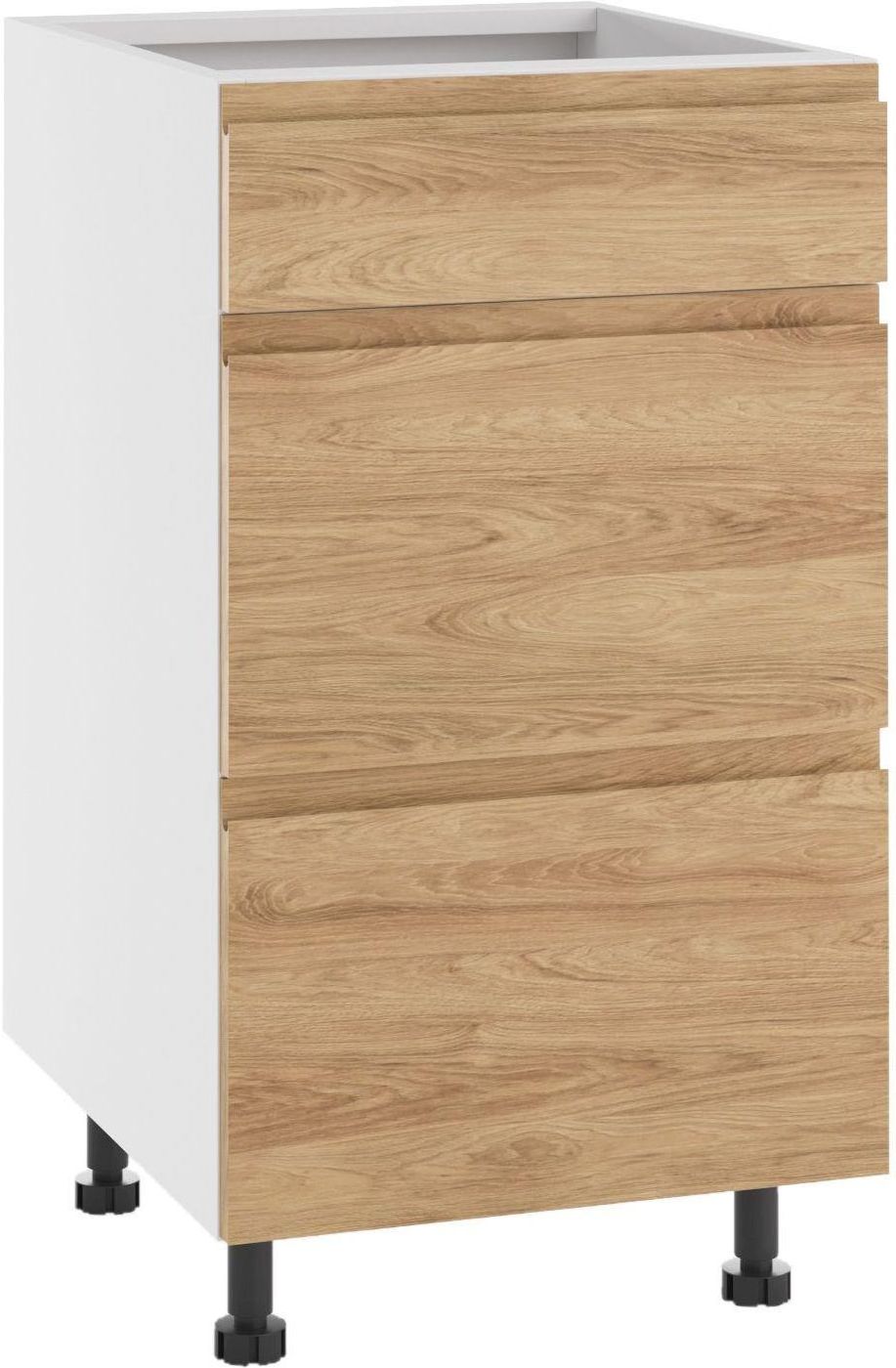 ALBA SZAFKA DOLNA DS-45-2W-1N BLUM HIKORA to szafka z szufladami w ilości trzech sztuk na prowadnicach Blum Antaro, które zapewniają system cichego domknięcia. Szafka dolna do kuchni posiada front w ciepłym odcieniu Hikora imitującym strukturę mebli kuchennych z drewna naturalnego. Kolekcja kuchni Komfort wykonana została z trwałej i łatwej w pielęgnacji płyty laminowanej. Meble kuchenne Alba doskonale odnajdą się w aranżacjach rustykalnych, skandynawskich, nowoczesnych i eklektycznych. Prezentowany model szafki z szufladami mierzy 45 cm szerokości, 82 cm wysokości oraz 53 cm głębokości.
