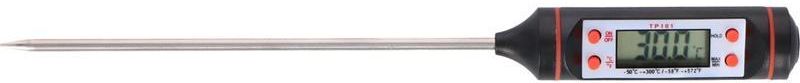 Termometr do mięsa jest bardzo przydatnym narzędziem podczas gotowania dużego kawałka mięsa w piekarniku lub na patelni. Trudno jest wtedy sprawdzić "na oko", czy mięso jest ugotowane lub czy osiągnęło odpowiedni stopień wysmażenia. Dzięki cyfrowemu termometrowi do pieczenia firmy alpina można dokładnie zmierzyć stopień wysmażenia.Trzpień przewodzący ciepło Termometr kuchenny alpina składa się z 2 części: przewodzącego ciepło trzpienia ze stali nierdzewnej i obudowy z cyfrowym wyświetlaczem. Aby zmierzyć temperaturę mięsa, należy włożyć trzpień w najgrubszą część mięsa. Gdy na wyświetlaczu pojawi się prawidłowa temperatura, można mieć pewność, że mięso jest ugotowane. Automatyczne wyłączanie Zakres pomiarowy tego termometru wynosi od -50°C do +300°C. Możesz wybrać, czy chcesz ustawić go na stopnie Celsjusza, czy stopnie Fahrenheita. Jeśli termometr do mięsa nie będzie używany przez 10 minut, wyłączy się automatycznie. Oszczędza to baterię AG13/LR44 dostarczoną do zasilania termometru do mięsa. Uwaga: tego cyfrowego termometru kuchennego nigdy nie należy myć w zmywarce. Wystarczy opłukać go pod bieżącą wodą. Specyfikacja termometru kuchennego Alpina Zakres pomiarowy: -50°C - +300°C Ostatni pomiar jest zapisywanyAutomatyczne wyłączanie po 10 minutachWyświetlacz w °C lub °FCyfrowy wyświetlaczDługość: 24 cmZawiera 1x baterię AG13/LR44Zatwierdzony przez CE Termometr do pieczenia to dobry pomocnik w perfekcyjnym przyrządzaniu mięsa. Z łatwym do odczytania wyświetlaczem temperatury od -50 do +300°C lub od -58°F do +572°F. Obie wartości mogą być wyświetlane na wyświetlaczu w celu pomiaru temperatury pieczeni, mięsa, ryb itp. Z funkcją pamięci ostatniego wskazania. Wyłącza się automatycznie po 10 minutach dzięki funkcji oszczędzania energii. Może być przechowywany w praktycznym pokrowcu ochronnym. Cechy: - Czytelny wyświetlacz temperatury - Zakres pomiaru od -50 do +300°C - Funkcja pamięci ostatniego wskazania - Automatyczne wyłączanie po 10 minutach - Praktyczny pokrowiec ochronny do przechowywania Dane techniczne: - Zasilanie bateryjne: tak - Zakres pomiaru temperatury: -50...+300°C (-58...+572°F) - Dokładność: ±1°C (od -10...+100°C), ±2°C (od -20...-10°C/+100...+150°C), w przeciwnym razie ±2°C - Sonda wsuwana ze stali nierdzewnej: 140 mm - Kolor: czarny/biały - Materiał: tworzywo sztuczne/stal nierdzewna - Wymiary: 25x240 mm - Waga: 52 g Zakres dostawy: - 1x termometr do pieczenia - 1x instrukcja obsługi
