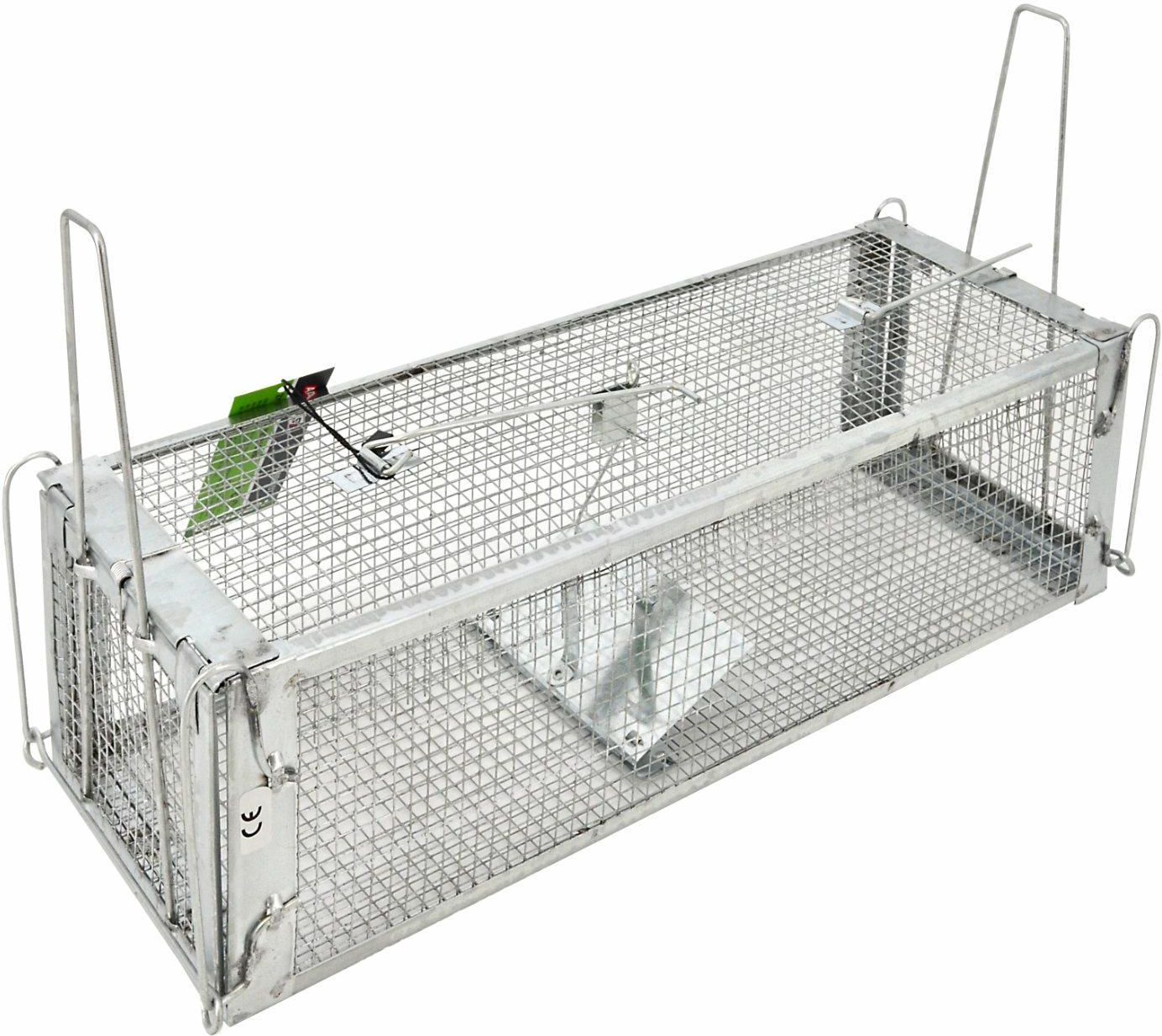 Wykonana z wytrzymałej, ocynkowanej siatki stalowej, odpornej na przegryzienia i uszkodzenia. Prosta konstrukcja zatrzaskowa z blokadą drzwi pozwala na bezpieczne i humanitarne łapanie gryzoni. Można ją łatwo opróżnić bez dotykania zwierzęcia. Skuteczna w łapaniu szczurów, wiewiórek, kun, fretek, łasic, norek, i innych dzikich zwierząt. Produkt wielokrotnego użytku. Dane techniczne: Wymiary: 420*140*110mm Rozmiar oczka siatki: 5x5mm Waga: 700g
