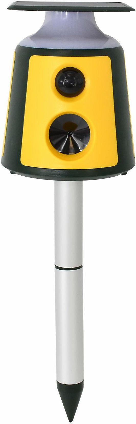 Wyposażony w głośniki ultradźwiękowe, które emitują dźwięki o wysokiej częstotliwości, alarm dźwiękowy, inteligentny czujnik ruchu PIR, oraz migające diody LED. Posiada panel solarny umieszczony na górze, który ładuje się za pomocą energii słonecznej lub portu USB. Trwała obudowa ABS zapewnia odporność na uszkodzenia mechaniczne oraz sprawdzi się w każdych warunkach pogodowych. Dołączony kolec do wbijania w ziemię umożliwia łatwą i szybką instalację. Skuteczny w odstraszaniu kotów, psów, szczurów, myszy, wiewiórek, królików, kun, fretek i ptaków, a także innych dzikich zwierząt ogrodowych. Nie zagraża życiu i zdrowiu zwierząt czy ludzi, a także nie wpływa negatywnie na środowisko. Dane techniczne: Zasilanie: panel solarny, aumulator litowy 2200mAh 3.7V Zasięg wykrywania: 1-10m/ kąt reakcji: 360° Zasięg działania: 400m2 Częstotliwość ultradźwiękowa: 13-65.5 kHz (5 trybów pracy) Stopień ochrony: IP56 Wymiary: 95*130*220mm Waga: 440g