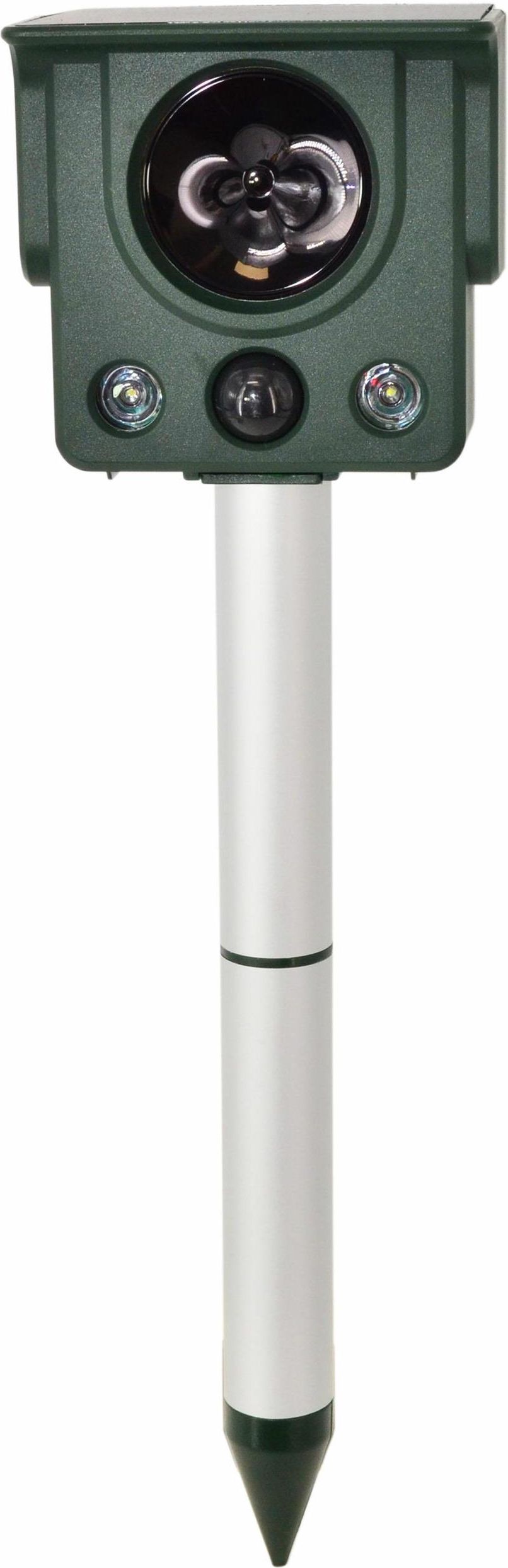 Wyposażony w głośnik ultradźwiękowy, który emituje dźwięki o wysokiej częstotliwości, alarm dźwiękowy, inteligentny czujnik ruchu PIR, oraz migające diody LED. Panel solarny ładuje wbudowany akumulator za pomocą energii słonecznej lub USB. Trwała obudowa ABS zapewnia odporność na uszkodzenia mechaniczne oraz sprawdzi się w każdych warunkach pogodowych. Dołączony kolec do wbijania w ziemię umożliwia łatwą i szybką instalację. Skuteczny w odstraszaniu kotów, psów, szczurów, myszy, wiewiórek, królików, kun, fretek i ptaków, a także innych dzikich zwierząt ogrodowych. Nie zagraża życiu i zdrowiu zwierząt czy ludzi, a także nie wpływa negatywnie na środowisko. Dane techniczne: Zasilanie: akumulator 2000mAh, Li-ion Zasięg wykrywania: 1-10m/ kąt reakcji: 110° Zasięg działania: 300m2 Częstotliwość ultradźwiękowa: 13-65 kHz Stopień ochrony: IP56 Wymiary: 90*88*245mm Waga: 290g