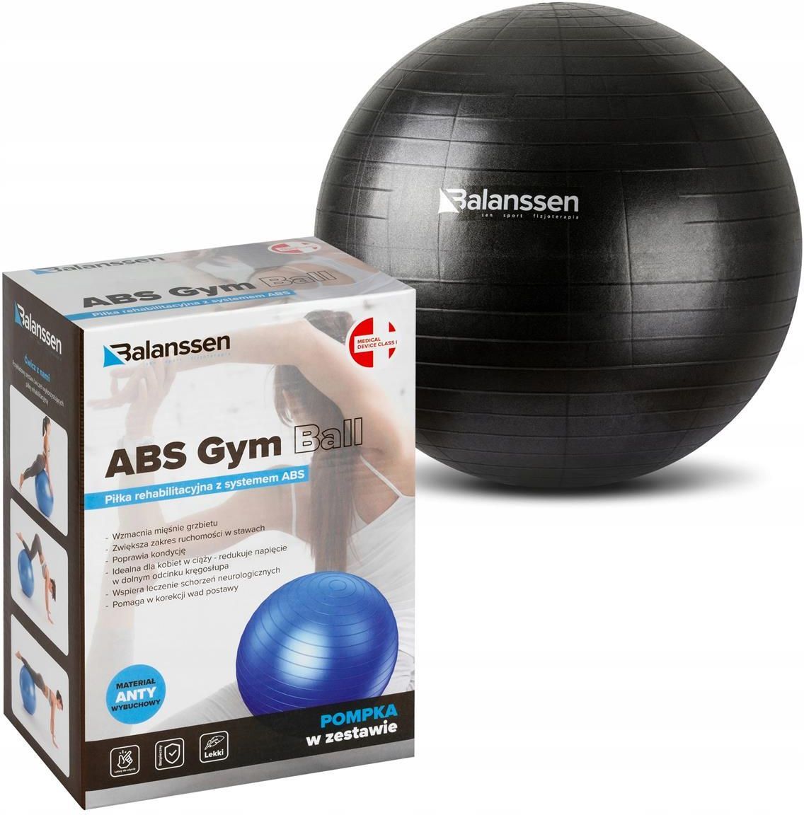 PIŁKA GIMNASTYCZNA REHABILITACYJNA FITNESS 75 CM ABS GYM BALL 75 CM Piłka rehabilitacyjna z systemem Balanssen przeznaczona jest do stosowana w terapii wzmocnienia mięśni grzbietu, zwiększenia ruchomości w stawach oraz poprawie kondycji i koordynacji ruchowej, w schorzeniach neurologicznych i korekcji wad postawy. Jest popularna wśród kobiet w ciąży, które często zmagają się z bólem odcinka lędźwiowego. Detale produktu Średnica piłki po napompowaniu : 75 cm Kolor: czarny Bezpieczeństwo: system anti-burst W skład zestawu wchodzą Piłka 75 cm BALANSSEN Pompka IDEALNA NA PREZENT DLA BLISKIEJ OSOBY Piłka gimnastyczna Balanssen to idealny sposób na urozmaicenie treningów. Jej szerokie zastosowanie sprawdzi się doskonale od ćwiczeń ogólnorozwojowych po ćwiczenia rehabilitacyjne . Trening z piłką skutecznie angażuje do pracy mięśnie głębokie oraz rozwija zmysł równowagi. Doskonale rozluźnia całe ciało, stanowi również skuteczny sposób na wzmocnienie mięśni głębokich oraz całego kręgosłupa. Tym samym, zmniejsza odczuwane dolegliwości bólowe w okolicach pleców oraz redukuje ryzyko ich wystąpienia w przyszłości ABS Gym Ball to praktyczna piłka do ćwiczeń, która korzystnie wpływa na kręgosłup oraz postawę naszego ciała. Atutem piłki jest trwały materiał, z którego została wykonana, dzięki czemu może nam służyć przez naprawdę długi okres czasu. Piłka do ćwiczeń - działanie koryguje wady postawy ciała, wzmacnia mięśnie grzbietu, poprawia kondycję i koordynację ruchową, łagodzi ból kręgosłupa, zmniejsza napięcie w odcinku lędźwiowym, angażuje do pracy mięśnie głębokie, pomaga w leczeniu schorzeń neurologicznych, zwiększa zakres ruchomości w stawach. Piłka do ćwiczeń znajduje zastosowanie wśród kobiet w ciąży i osób w każdym wieku, na zajęciach fitness czy pilatesu, podczas rehabilitacji, w szkole lub przedszkolu, w domowym zaciszu. Wykorzystywana jest podczas ćwiczeń, które zwiększają ruchomość w stawach, wzmacniają mięśnie grzbietu, poprawiają koordynację ruchową. Piłki rehabilitacyjne ABS GYM BALL marki BALANSSEN to wyrób medyczny klasy I Nasze piłki zostały zarejestrowane w Urzędzie Rejestracji Produktów Leczniczych Wyrobów Medycznych i Produktów Biobójczych. Dzięki temu masz pewność, że korzystanie z nich jest w pełni bezpieczne.