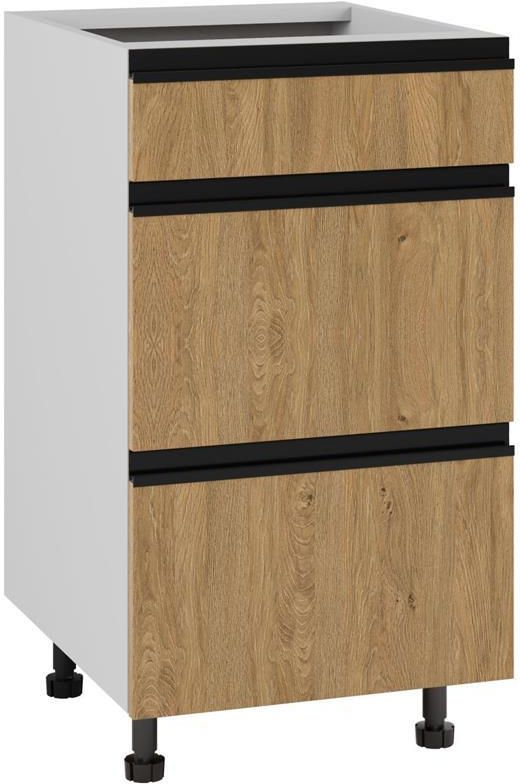 BARI PLUS SZAFKA DOLNA DS-45-2W-1N_METABOX DĄB KAMIENNY to propozycja szafki z szufladami w ilości trzech sztuk o zróżnicowanej pojemności. Model z kolekcji kuchni Komfort wyposażony został w charakterystyczny uchwyt w formie czarnej listwy. Prezentowana szafka z szufladami mierzy 45 cm szerokości, 57 cm wysokości oraz 53 cm głębokości. Imitowane na meblach kuchennych drewno naturalne wiernie odzwierciedla przytulny kolor oraz strukturę dębu kamiennego. Kolekcja kuchni Komfort wykonana została z niezawodnej płyty laminowanej o wysokie odporności na uszkodzenia mechaniczne.