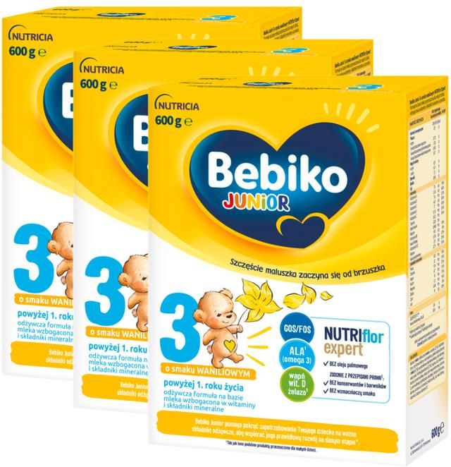 Bebiko Junior 3 odżywcza formuła na bazie mleka dla dzieci powyżej 1. roku o smaku waniliowym 3x600g Opis produktu Bebiko Junior 3 NUTRIflor Expert o smaku waniliowym to odżywcza formuła opracowana z myślą o wspieraniu prawidłowego rozwoju i odporności dziecka na każdym etapie jego wzrostu*. Dzięki starannie dobranym składnikom, Bebiko Junior pomaga zaspokajać codzienne potrzeby żywieniowe dziecka, dostarczając niezbędne składniki odżywcze. Zalety produktu: Wysoka jakość składników Unikalna kompozycja GOS/FOS wspierająca naturalną mikroflorę jelit ALA (omega-3), który wspomaga rozwój mózgu i układu nerwowego Wapń i witamina D – ważne dla prawidłowego rozwoju kości i zębów Witaminy A, C i D – wspierają prawidłowe funkcjonowanie układu odpornościowego Żelazo i jod – wspomagają rozwój funkcji poznawczych Produkt nie zawiera: oleju palmowego konserwantów sztucznych barwników wzmacniaczy smaku Bebiko Junior 3 to smaczna formuła waniliowa wspierająca codzienną dietę i prawidłowy rozwój dziecka. Składniki: laktoza z mleka, odtłuszczone mleko w proszku (25%), maltodekstryna, olej słonecznikowy, olej rzepakowy, galaktooligosacharydy z mleka (4,5%), wysokoolienowy olej słonecznikowy, olej kokosowy, wapń, potas, fruktooligosacharydy (0,3%), magnez, sód, witamina C, inozytol, aromat waniliowy, żelazo, cynk, kwas pantotenowy, witamina E, przeciwutleniacz (palmitynian L-askorbylu), niacyna, ryboflawina, tiamina, witamina A, witamina D, witamina B6, jod, kwas foliowy, witamina K, biotyna, witamina B12.