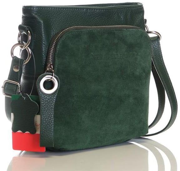 Marka VERA PELLE to czołowy włoski producent galanterii skórzanej. Każda torebka tej marki to najwyższej jakości roślinnie wyprawiana skóra bydlęca wykończona mocnymi okuciami i wytrzymałą podszewką. Użyte materiały oraz dbałość o każdy detal sprawiają, że każdy model sygnowany logiem VERA PELLE odnosi sukces na europejskim rynku. Cena w sklepach: 249zł Nasza cena: 149zł Zachwycająca wyglądem torebka damska wykonana z naturalnej skóry DOLLARO oraz zamszu naturalnego. Nowy model w sezonie 2021/22. Ozdobna końcówka przy zamku oraz różne faktury skór dodają torebce uroku. Delikatne logo producenta wytłoczone na froncie. Wnętrze torebki jest jednokomorowe z kieszonką zamykaną na zamek oraz kieszonką otwartą np na telefon. Całość zapinana na zamek. Na zewnątrz z przodu i z tyłu praktyczne kieszonki zamykane na zamek. Długi, regulowany pasek umożliwia noszenie torebki przez ramię. Poręczny i praktyczny model. Pojemny, mimo teoretycznie niewielkich rozmiarów. Doskonała propozycja na co dzień.