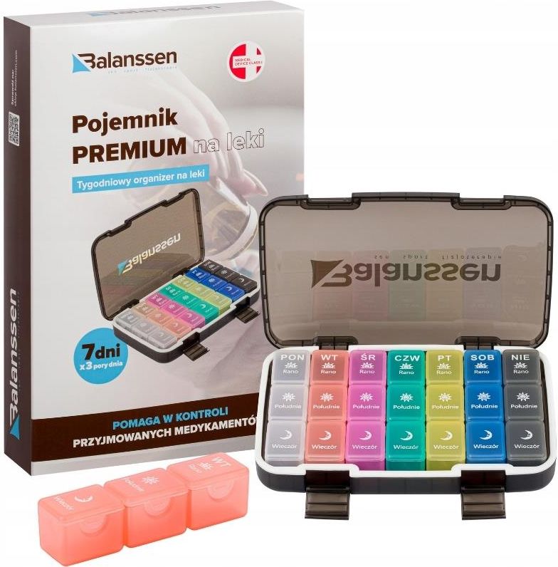 KASETKA TYGODNIOWA PREMIUM NA LEKI NA - 3 PORY DNIA(rano, popołudnie, wieczór) x 7 dni + ETUI Pojemnik kasetka pudełko na leki tabletki 7 dni x 3 to specjalnie zaprojektowany organizer, który ma pomóc pacjentom w przyjmowaniu leków przepisanym schematem dawkowania. Dzięki niemu ryzyko pominięcia dawki medykamentów zostaje zminimalizowane. Pojemnik posiada odpowiednie komory, które pomieszczą nawet największe lekarstwa, jest wygodny również w podróży. Każdy pojemnik na dzień tygodnia ma inny kolor i jest oznaczony nazwą tego dnia. Każda szuflada tygodnia posiada 3 opisane przegrody z podziałem na porę dnia (rano, popołudnie, wieczór). Posiada również infografikę pory dnia. Dzięki temu organizatorowi można regularnie stosować leki przez cały tydzień. Jest łatwy w użytkowaniu. Etui zabezpiecza kasetki z lekami. INSTRUKCJA UŻYTKOWANIA Uzupełnij organizer lekami, wg zaleceń lekarza lub farmaceuty, pamiętając o porach dnia przyjmowanych leków. Rozpocznij od kasetki, z dniem od którego rozpoczynasz korzystanie z organizera na leki Każda przegródka jest zamykana Chronić przed dziećmi. CECHY PRODUKTU umożliwia rozłożenie codziennej porcji leków na 3 dawki na 7 dni wykonana z polipropylenu niesterylny ZASTOSOWANIE przeznaczony do dzielenia leków w warunkach domowych, szpitalnych, DPS Na tej aukcji kupujesz kasetkę: TYGODNIOWAPREMIUM 3 pory dnia - kolorystyka jak na załączonych zdjęciach. INNE KASETKI DOSTĘPNE NA NASZYCH POZOSTAŁYCH AUKCJACH. CENA DOTYCZY 1 SZTUKI DANE TECHNICZNE długość: 24,5 cm szerokość: 15,5 cm wysokość: 3,5 cm Kasetka na leki Balanssen to wyrób medyczny klasy I Nasze produkty zostały zarejestrowane są w Urzędzie Rejestracji Produktów Leczniczych Wyrobów Medycznych i Produktów Biobójczych. Dzięki temu masz pewność, że korzystanie z nich jest w pełni bezpieczne.
