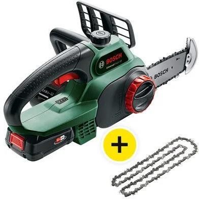 Akumulatorowa piła łańcuchowa UniversalChain 18 Bosch. W wyposażeniu oferowanej piły łańcuchowej znajdują się: 2 akumulatory PBA 18V o pojemności 2,5Ah Li-Ion cyfrowa ładowarka sieciowa AL18V-20 olej do smarowania łańcucha 80 ml łańcuch tnący prowadnica łańcucha osłona łańcucha Parametry techniczne: Napięcie akumulatora: 18V Li-Ion Pojemność akumulatora: 2,5 Ah Długość prowadnicy łańcucha: 20 cm Prędkość przesuwu łańcucha: 4,5 m/s Pojemność zbiornika na olej smarujący: 80 ml System naciągu łańcucha: BOSCH SDS (bez narzędziowy) Czas ładowania 40 minut (80% naładowania akumulatora) Czas ładowania 60 minut (100% naładowania akumulatora) Ciężar z akumulatorem: 3,0 kg Stalowe zębate koła napędowe Osłona prowadnicy Protector wraz z kolcami oporowymi Hamulec odrzutowy QUICK STOP Automatyczny system smarowania łańcucha Firma BOSCH opracowała nową ofertę akumulatorowych pił łańcuchowych i wyposażyła je w wiele przydatnych funkcji. Wszystkie modele charakteryzują się niewielkim ciężarem, który wynosi 3 kg i posiadają sprawdzony, bez narzędziowy system napinania łańcucha BOSCH SDS, ułatwiający i skracający czas wymiany łańcucha. Dzięki niemu wymianę lub regulację naciągu łańcucha dokonuje się bez używania jakichkolwiek dodatkowych narzędzi. Wystarczy kilka prostych czynności tzn: zamocowanie łańcucha, dwukrotny obrót koła nastawczego i piła łańcuchowa jest gotowa do pracy. Piła łańcuchowa UniversalChain 18 to bardzo poręczna i bardzo lekka piła akumulatorowa. Idealnie sprawdzi się w pracy w ogrodzie i koło domu. Piła została wyposażona w 2 akumulatory litowo-jonowe 18V o bardzo dużej pojemności – 2,5 Ah. Akumulatory litowo-jonowe 18V / 2,5 Ah BOSCH to akumulatory nie posiadające efektu pamięci oraz efektu samorozładowania, dodatkowo są odporne na nieregularne ładowanie (doładowywanie). Nawet po długim okresie nie używania są bardzo wydajne i zapewniają pełną gotowość do pracy. W każdej chwili można je doładowywać i nie ma obawy, że zostaną uszkodzone. Dodatkowo piła UniversalChain 18 została wyposażona w najnowsze systemy przeciw przeciążeniowe – system elektronicznej ochrony ECP oraz system zarządzania energią cieplną. System elektronicznej ochrony ECP (Electronic Cell Protection) firmy BOSCH dzięki któremu okres użytkowania akumulatora i silnika został wydłużony kilkukrotnie, chroni on akumulator i silnik przed przeciążeniem i przegrzaniem oraz zapobiega przed głębokim rozładowaniem akumulatora. System zarządzania energią cieplną firmy BOSCH to system, który reguluje pracą urządzenia w przypadku zagrożenia przegrzaniem. Zapewnia optymalne odprowadzenie ciepła, obniża temperaturę akumulatora i w trakcie pracy chroni ogniwa przed nadmiernym nagrzaniem. Piła łańcuchowa UniversalChain 18 jest równie wydajna jak typowe piły sieciowe, a przy tym bardziej poręczna, lekka i niezależna ponieważ nie posiada przewodu zasilającego. W wyposażeniu seryjnym znajduje się najnowszej generacji ładowarka sieciowa – model AL 18V-20 PROFESSIONAL. Ładowarka AL 18V-20 PROFESSIONAL firmy BOSCH to najnowsza ładowarka sieciowa z mikroprocesorowym sterowaniem, wyposażona w system szybkiego ładowania. Dodatkowo ładowarka została wyposażona w inteligentny system kontroli temperatury akumulatora, dzięki czemu akumulator jest ładowany tylko i wyłącznie w idealnych warunkach. Wszystkie procesy oraz wszelkie uszkodzenia są określane przy pomocy wbudowanych wskaźników diodowych. System Power for ALL 18V - czyli jeden akumulator i jedna ładowarka do obsługi wszystkich elektronarzędzi z oferty elektronarzędzi amatorskich (zielonych) oraz elektronarzędzi ogrodowych Duża prędkością przesuwu łańcucha wynoszącą 4,5 m/s zapewnia dobre rezultaty cięcia podczas przycinki drzew w ogrodzie, czy podczas cięcia drewna kominkowego, a specjalny chromowany łańcuch zachowuje ostrość przez długi czas. Hamulec odrzutowy QUICK STOP zatrzymuje urządzenie w ciągu jednej dziesiątej sekundy, dzięki czemu piła jest bezpieczna i gwarantuje bezstresową obsługę. W przypadku zwolnienia przycisku włącznika hamulec wybiegowy zatrzymuje łańcuch w ciągu jednej sekundy, a dzięki stabilizatorowi wysokości, ogniwa spinające łańcuch obniżają skłonność urządzenia do odrzutu i drgań. System BOSCH SDS ułatwiający i skracający czas wymiany łańcucha, czy prowdnicy. Dzięki niemu wymianę lub regulację naciągu łańcucha dokonuje się bez użycia jakichkolwiek dodatkowych narzędzi. Wystarczy kilka prostych czynności tzn: zamocowanie łańcucha, dwukrotny obrót koła nastawczego i piła łańcuchowa jest gotowa do pracy. Automatyczny system smarowania łańcucha ze wskaźnikiem poziomu oleju i zbiornikiem o pojemności - 80ml. Niewielka waga – zaledwie 3,0 kg sprawia, że praca pilarką łańcuchową firmy BOSCH jest łatwa i wygodna. Osłona prowadnicy Protector i kolce oporowe umożliwiają łatwe podcinanie gałęzi przy minimalnym ryzyku ich uszkodzenia. Piła umożliwia wszechstronność zastosowań - przycinka gałęzi, usuwanie ściętych odpadów i cięcie drewna na opał. Wskaźnik stanu naładowania akumulatora, dzięki któremu użytkownik w każdej chwili może sprawdzić czy akumulator należy naładować czy nie. Antywibracyjna rękojeść pokryta materiałem typu Softgrip zwiększa wygodę pracy oraz zapobiega wyślizgiwaniu się narzędzia z rąk i zmniejsza drgania przenoszone na dłonie. Dostawa zawiera: Akumulatorową piłę łańcuchową firmy BOSCH 2 akumulatory PBA 18V o pojemności 2,5Ah Li-Ion Cyfrowa ładowarka sieciowa AL18V-20 Olej do smarowania łańcucha 80 ml 2 łańcuchy tnące Osłonę łańcucha Prowadnicę łańcucha Instrukcję obsługi w języku polskim