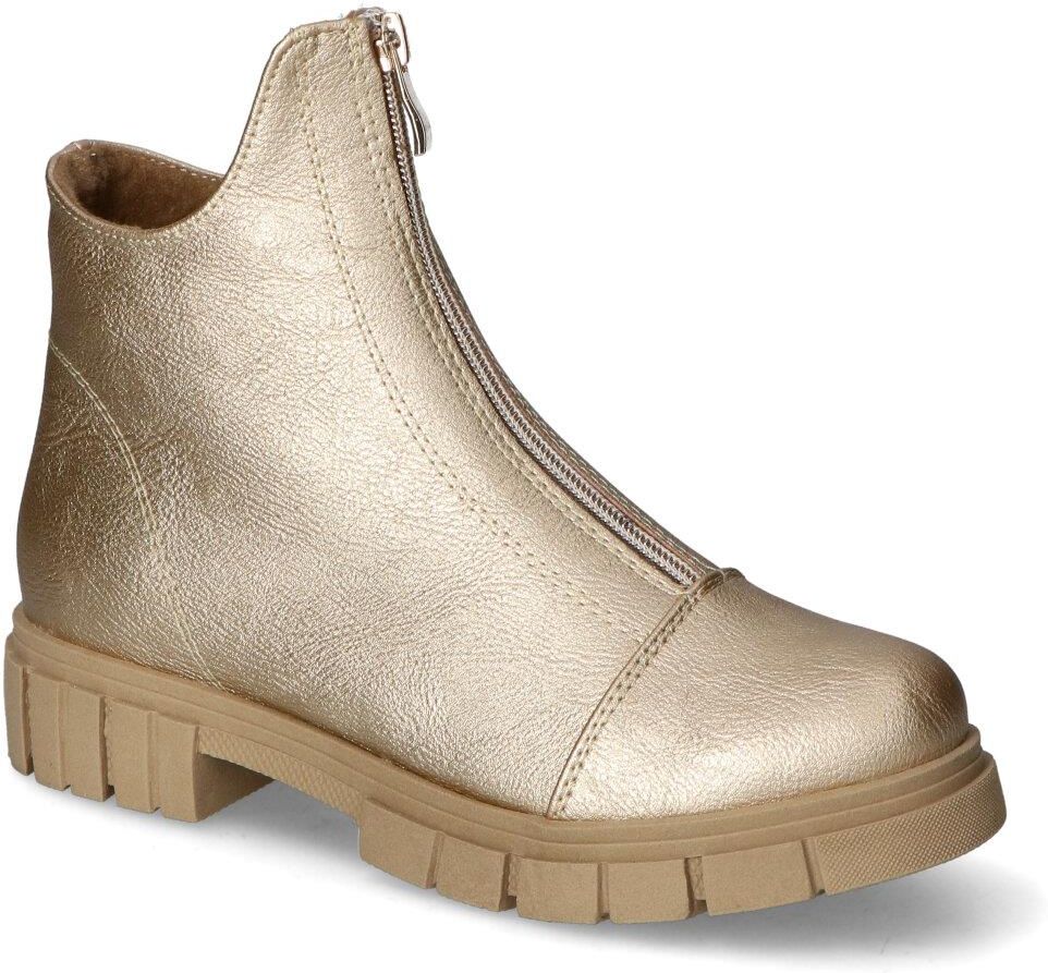 Eleganckie botki firmy Kamex-but: - cholewka wykonana została ze skóry ekologicznej - wnętrze zostało pokryte materiałem ocieplającym - ocieplana wkładka wewnętrzna aby zapewnić ciepło podczas użytkowania w zimne dni - obcas o wys. 4 cm zapewnia odpowiednią stabilizację - zamek błyskawiczny ułatwia zakładanie i dopasowanie obuwia - złoty kolor i modny fason tworzą efekt, który zachwyci każdego!