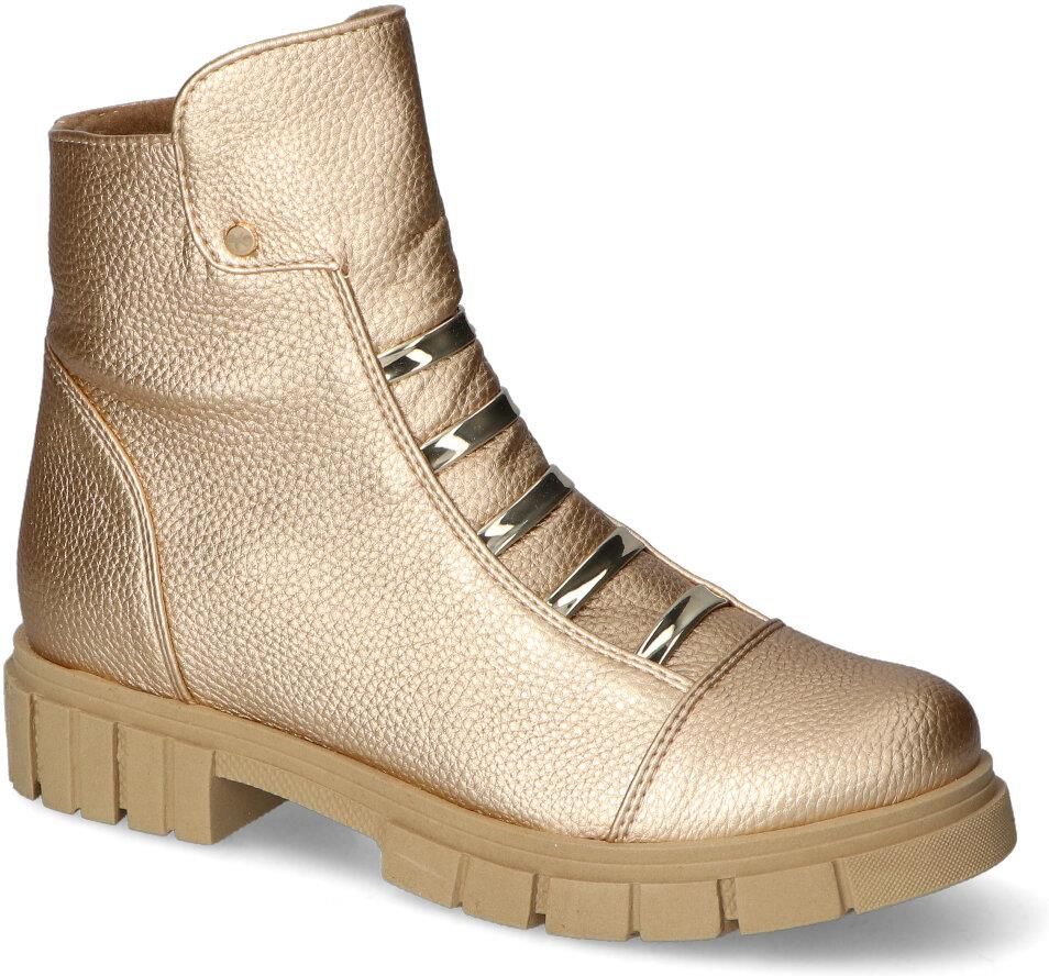 Eleganckie botki firmy Kamex-but: - cholewka wykonana została ze skóry ekologicznej - wnętrze zostało pokryte materiałem ocieplającym - ocieplana wkładka wewnętrzna aby zapewnić ciepło podczas użytkowania w zimne dni - obcas o wys. 3,5 cm zapewnia odpowiednią stabilizację - zamek błyskawiczny ułatwia zakładanie i dopasowanie obuwia - złoty kolor i modny fason tworzą idealne połączenie, które zachwyci każdego!