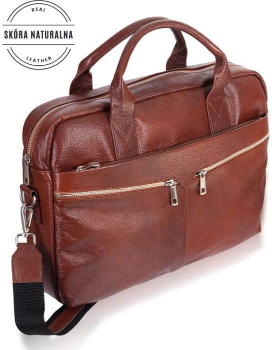 Męska torba na ramie polskiej produkcji, wykonana z najwyższej jakości przyjemnej w dotyku skóry naturalnej. Modny krój i ponadczasowa kolorystyka - zalety, które powinna posiadać każda porządna torba męska to ważne aspekty wizualne, ale nie możemy zapominać o walorach praktycznych torby, które niejednokrotnie są najważniejsze. Prezentowana torba dla mężczyzny doskonale łączy ze sobą jedno i drugie! Wnętrze torby: Dwie duże komory wewnątrz torby dostępne bezpośrednio pod zamkiem głównym pomieszczą dokumenty A4, laptopa o rozmiarze 15,6 cali i jego akcesoria. Pomiędzy nimi duża kieszeń dodatkowo zamykana na suwak. Ponad to mniejsze kieszonki wewnętrzne torby na drobiazgi, długopisy, telefon, wizytówki. Warto zwrócić uwagę na jakość podszewki użytej do wykończenia wnętrza torby - tego rodzaju materiał jest używany tylko w najdroższych torbach znanych producentów, kilkukrotnie droższych od prezentowanej torby. Na zewnątrz: Torba męska posiada krótkie, mocne, skórzane rączki gwarantujące pewny i mocny chwyt. Jeżeli potrzebujesz wolnych rąk do dyspozycji jest jeszcze długi, regulowany pasek do noszenia torby na ramieniu lub przez ramie. Pasek wykonany jest z taśmy nośnej podszytej skórą, zakończony mocnymi karabinkami - masz pewność że Twoja torba męska może być naprawdę solidnie zapakowana i nic się nie urwie. Umiejscowiony z tyłu uchwyt umożliwi założenie torby na wysuwane rączki walizki - świetne rozwiązanie w podróży. Kolejnym plusem jest zabezpieczenie metalowymi stopkami spodu torby. Wspomniane wcześniej uporządkowane wnętrze nie pomoże jeżeli męska torba skórzana nie będzie miała wystarczającej ilości kieszonek na zewnątrz. Kto chciałby w pośpiechu szukać kluczy, telefonu czy portfela w zapakowanym wnętrzu torby? Tu z pomocą przychodzą: dwie mniejsze i jedna duża kieszonka z przodu oraz całkiem pojemna z tyłu - wszystkie zamykane na zamek błyskawiczny. Pakowna męska torba idealnie sprawdzi się w pracy, na uczelni czy też w podróży, pomieści naprawdę dużo, a przy tym wygląda efektownie i stylowo.