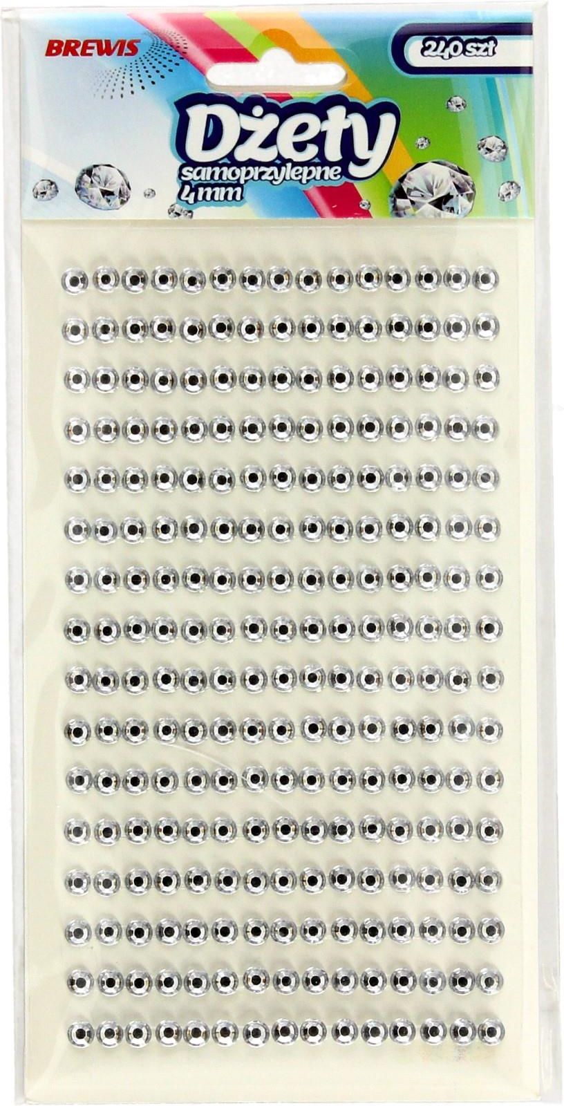 Srebrne dżety samoprzylepne o średnicy 4mm - 240 sztuk Przedstawiamy srebrne dżety o samoprzylepnej formie. Wyroby te, mające średnicę 4 mm, oferowane są w ilości 240 sztuk. EAN: 5906190684424