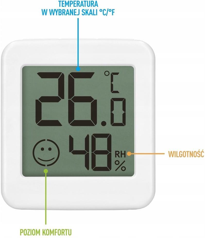 Termometr elektroniczny ze wskaźnikiem komfortu biały Renomowanej marki BROWIN Model 170102 Ten wielofunkcyjny, elektroniczny termometr marki Bioterm jest urządzeniem, które ułatwi Ci zapewnienie najwyższego poziom komfortu w Twoim otoczeniu. Miej temperaturę "na oku" - w każdym ważnym dla Ciebie pomieszczeniu. Szeroki zakres temperatur - urządzenie pokazuje temperaturę w zakresie od -10°C do +50°C, odczyt możliwy jest zarówno w °C, jak i °F. Wskaźnik komfortowego poziomu wilgotności - termometr dostarcza informacji o aktualnej temperaturze i poziomie wilgotności w pomieszczeniu, a dodatkowy wskaźnik w formie wyświetlającej się na ekranie uśmiechniętej lub zasmuconej „buźki” pokazuje aktualny poziom komfortu. Funkcjonalne mocowanie - nóżka oraz magnes umieszczone na tylnej części urządzenia pozwalają na wygodne korzystanie z termometru - można go umieścić na stałe w jednym miejscu lub przenosić i mocować na dostępnych metalowych powierzchniach. BEZprzewodowy - termometr uruchamiany jest po włożeniu do niego baterii, która nie jest dołączona do zestawu. Jakość i modny design - dzięki estetyce wykonania, kompaktowości, prostej formie czy ponadczasowemu białemu kolorowi, termometr świetnie się sprawdzi w różnych wnętrzach, w domu i w pracy. PAMIĘTAJ! KUPUJESZ U OFICJALNEGO DYSTRYBUTORA! Codzienny odczyt temperatury w pomieszczeniach, w których Ty i Twoja rodzina spędzacie często większość czasu, pozwali Ci lepiej zadbać o Wasze zdrowie i dobre samopoczucie. A pomoże w tym ten oto niewielki i kompaktowy termometr elektroniczny - ze wskaźnikiem wilgotności. W prosty i wygodny sposób sprawdzisz istotne parametry. Czytelny wyświetlacz pokaże aktualną temperaturę i poziom wilgotności, a trzystopniowy wskaźnik komfortu w postaci uroczej „buźki” pomoże w utrzymaniu optymalnych warunków w pomieszczeniu. Dzięki wbudowanej stopce termometr stabilnie ustawisz na parapecie, biurku czy szafce nocnej. Magnes na tylnej ściance obudowy umożliwi przymocowanie urządzenia - na stałe lub tymczasowo - w miejscach, w których będzie najbardziej potrzebny. Temperaturę ustawisz zarówno w °C, jak i °F. Więcej o wpływie temperatury na Twój organizm przeczytasz na naszym blogu w artykule. Funkcje: pomiar temperatury w °C oraz °F format wyświetlania wilgotności: % RH skala wskazująca poziom wilgotności powietrza (sucho, komfortowo, wilgotno) wbudowany magnes oraz stopka dla łatwiejszego mocowania i ustawiania Zakres i dokładność pomiaru: zakres pomiaru temperatury: od -10°C do +50°C dokładność pomiaru temperatury: +/- 1°C zakres pomiaru wilgotności: 10-99% dokładność pomiaru wilgotności: +/- 1%, tolerancja +/- 5% wilg. wzgl. (w przedziale wilgotności 40-80%, +/- 8% (w pozostałych przedziałach) wskaźnik poziomu wilgotności („buźki”): zbyt sucho, komfortowo, zbyt wilgotno Zasilanie: bateria 1x CR2032 (3V) - brak w zestawie Zapraszamy na pozostałe aukcje gdzie mogą Państwo kupić produkty w kategoriach w których się specjalizujemy a całość wyślemy razem WINIARSTWO PIWOWARSTWO DESTYLATY WĘDLINIARSTWO SEROWARSTWO PIEKARNICTWO SZKŁO KUCHENNE I OZDOBNE STACJE POGODY AKCESORIA KUCHENNE OGRÓD BROWIN - bo domowe jest lepsze - BIOWIN