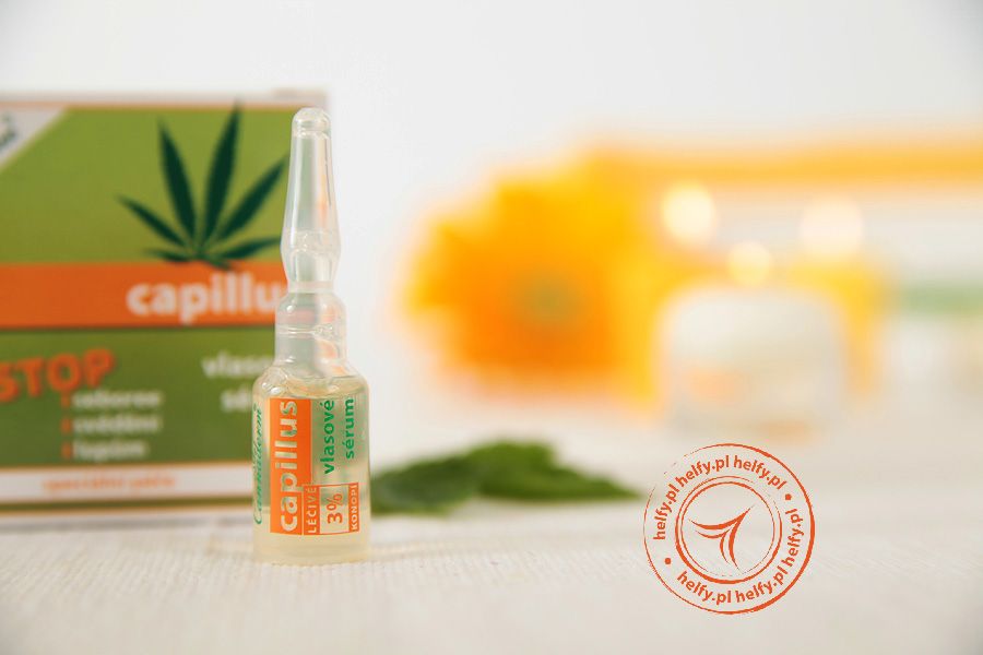 Capillus - Serum do Włosów Serum szczególnie polecane dla osób mających choroby skóry głowy takie jak: łojotok, nadmierne powstawanie łupieżu (tłusty i suchy) lub podrażnienia, zaczerwienienie, świąd. Serum zawiera wyciąg z konopi, sól z Morza martwego i ekstrakty z nasion mięty, które łagodzą objawy łojotoku, łupież i swędzenie oraz dają uczucie ukojenia. Serum daje efekt chłodzący, odświeża skórę i szybko łagodzi swędzenie i podrażnienie. Delikatny masaż głowy poprawia mikrokrążenie krwi i wzmaga przenikanie aktywnych składników serum w głąb skóry. W wyniku wielokrotnego użycia serum, znacząco zmniejsza się ilość łupieżu i nadmierna produkcja łoju. Skóra głowy zostaje nawilżona, nie swędzi i nie jest podrażniona. Poprawia stan i wygląd włosów. Uwaga! Osad na dnie ampułek to nie wada, to naturalna reakcja. Przed użyciem należy dokładnie wstrząsnąć. Sposób użycia: Zawsze stosować na umyte i osuszone włosy. Zrób we włosach przedziałki i aplikuj po kilka kropel w każde miejsce głowy. Zawartość ampułki powoli i delikatnie wmasować w skórę głowy. Stopniowo rozprowadzać serum na całą powierzchnię głowy i wzdłuż linii włosów. Nie spłukiwać. Serum najlepiej stosować co 2-3 dni. Widoczna poprawa skóry głowy pojawia się po 2-4 tygodniach regularnego stosowania serum. Jeśli problemy skórne nie znikną koniecznie skontaktuj się z lekarzem, ponieważ może to być objawem jakiejś choroby. Ingredients: Aqua, Urtica Urens Extract, Agrimonia Eupatoria Extract, Cannabis Sativa Seed Protein, Citrus Grandis Extract, Caffeine, Cannabis Sativa Seed Oil, Lecithin, Dead Sea Salt, Lactic Acid, Lavandula Augustifolia Oil, Zingiber Officinale Oil, Allantoin.
