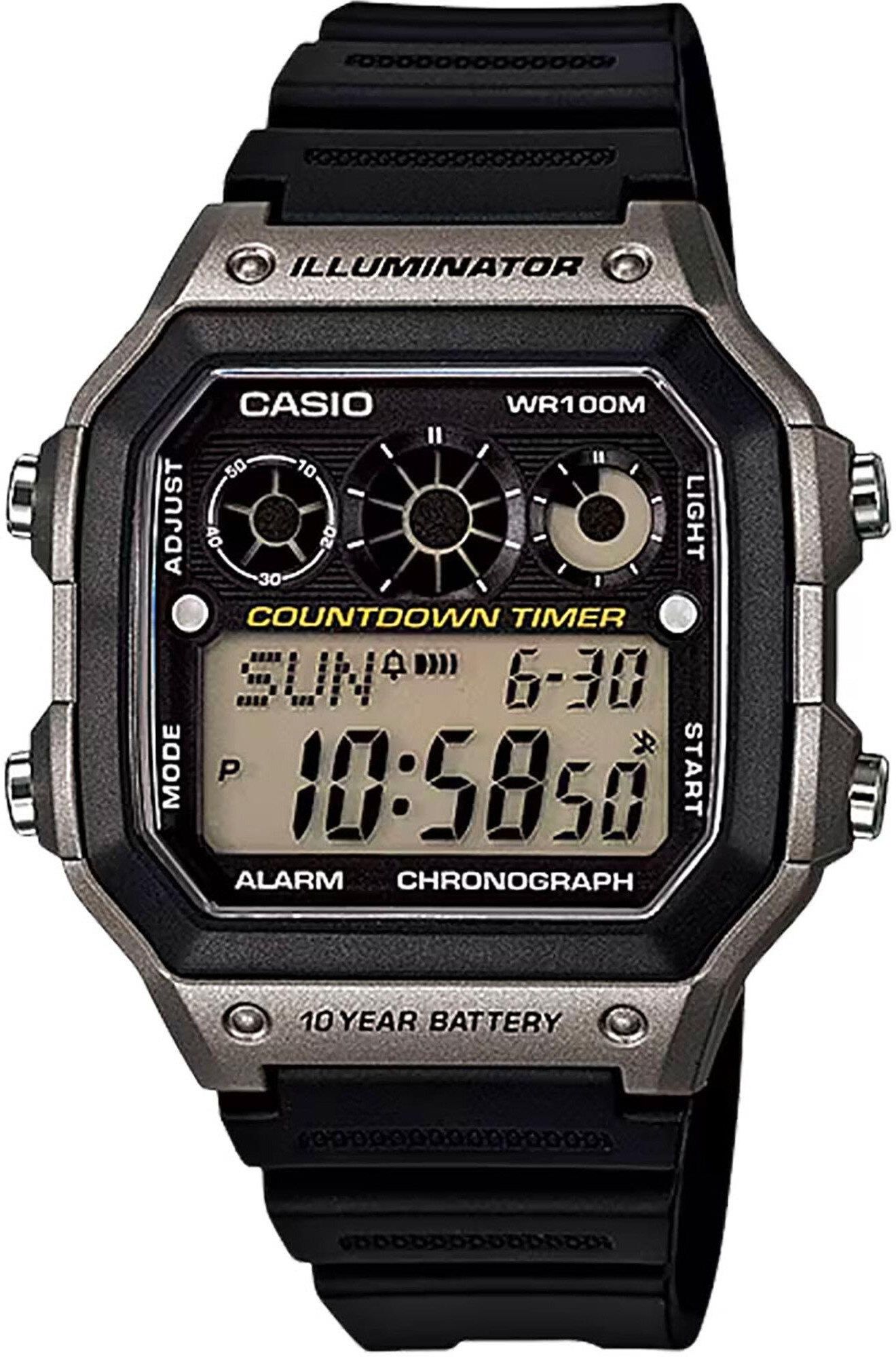 CASIO AE-1300WH - ze sportowej kolekcji charakteryzuje się dużą wytrzymałością i wodoszczelnością do 100m. Połączenie sportowego charakteru z niebanalnym wyglądem i prostotą. Niezawodność oraz oryginalny i nowoczesny design powoduje iż jest to jeden z ciekawszych modeli wśród sportowej kolekcji Casio. AE-1300WH-8A posiada mechanizm kwarcowy zasilany baterią. Zarówno pasek jak i koperta wykonane zostały z tworzywa, lekkiego i komfortowego w użytkowaniu. Tarczę zegarka możemy podświetlić w formie diody elektroluminescencyjnej LED. Zegarek umożliwia korzystanie ze stopera, który odmierza czas do 100 minut z dokładnością do 1/1 sekundy a także ustawić budzenie – posiada 1 alarm dzienny. Funkcja timera pozwala na odliczanie czasu wstecz - to aż 9 timerów z interwałami zaprogramowanymi na czas 45 minut. Dodatkowe atuty modelu to World Time czyli wyświetlanie czasu w różnych strefach czasowych na podstawie danych największych miast na świecie a także automatyczny kalendarz, dzięki któremu zegarek sam dostosowuję datę w przypadku krótszych lub dłuższych miesięcy.  Specyfikacja zegarka: Mechanizm: kwarcowy Miyota Citizen Japan Tarcza: kwarcowa Funkcje: Stoper, Alarmx5, Budzik, Data Podświetlenie: dioda LED Czas światowy: odczyt różnych stref czasowych Kalendarz automatyczny: z zaprogramowanymi datami do 2099r. ; zegarek sam dostosowuje daty w przypadku krótszych miesięcy Timer: 1/10 - sek. Zegarek wyposażony jest w funkcję liczącą czas do tyłu, możliwość ustawienia od 1 sek. do 24 godzin. Koperta: wysokogatunkowe wytrzymałe tworzywo sztuczne Szkiełko: mineralne o podwyższonej odporności na zarysowania i przypadkowe uderzenia. Pasek: poliwęglanowy, wodoodporny Wodoszczelność: 10 BAR Antyalergiczny: tak - nie zawiera niklu Wymiary w mm: Koperta: 40x42 Tarcza: 33x33 Grubość: 12,6 Pasek: szerokość: 18 Obwód: 165 - 235 Kolorystyka: Koperta: srebrna Tarcza: czarna Pasek: czarny