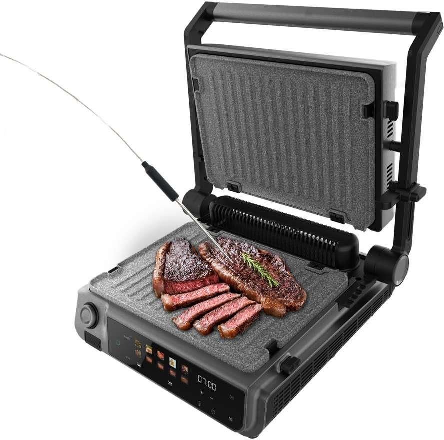 Inteligentna sonda temperatury: Kontroluj i reguluj temperaturę wewnętrzną żywności, aby zapewnić doskonałe rezultaty przy każdym gotowaniu. Wykorzystaj w pełni możliwości grillowania: ciesz się funkcją smash burger i bezdymnym gotowaniem o dużej mocy 2000 W. Wszechstronność i elastyczność: odwracalne płyty do grillowania lub grillowania, z możliwością oddzielnego ogrzewania w zakresie od 80 do 230°C, dostosowując się do różnych preparatów. Łatwe czyszczenie i konserwacja: tacka na śmieci i wyjmowane talerze, które można myć w zmywarce, co ułatwia czyszczenie i redukcję odpadów. Duża pojemność i elegancki wygląd: powierzchnia do gotowania o wymiarach 30 x 21 cm do przygotowywania posiłków dla każdego – obudowa ze stali nierdzewnej nadaje Twojej kuchni solidny, elegancki akcent.
