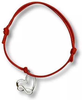 Bransoletka ze srebrnym, ażurowym serduszkiem z węzłem nieskończoności, zawieszonym na kolorowym rzemyku. Serce z węzłem nieskończoności symbolizuje wieczną miłość. Szerokość bransoletki z łatwością można dopasować do obwodu swojego nadgarstka. Uwaga: Bransoletki mają losowe kolory rzemyka! Zawieszka wykonana jest ze srebra.