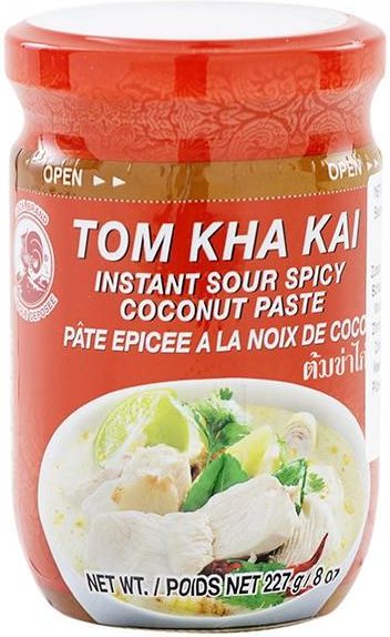 PASTA DO ZUPY Tom Kha Kai 227g SŁODKO OSTRA z kokosem Pasta Tom Kha to główny składnik tajskiego specjału- zupy Tom Kha Kai. Pasta jest łagodna i aromatyczna, w której wyraźnie dominuje galangal. Jest bardzo prosta w przyrządzeniu: zawartość słoika należy wymieszać z wodą lub bulionem, mlekiem kokosowym, dodać kurczaka i w ten sposób mamy gotową podstawową wersję tej zupy. Kraj pochodzenia: Tajlandia Gramatura: 227g Wartości odżywcze w 100g Gramatura: 227g wartość energetyczna: 580 kJ / 137 kcal tłuszcz: 1,2 g w tym kwasy tł. nasycone: 1,1g węglowodany: 29g w tymcukry: 22g białko: 2,5g sól: 12,1g Skład: mleczko kokosowe 35%, galangal 17%, cukier, sól, szalotka, czosnek, wzmacniacz smaku: E621, liście limonki Kaffir, trawa cytrynowa, regulator kwasowości: E330. OFERTA NIE DOTYCZY SPRZEDAŻY GOTOWEGO DANIA :)