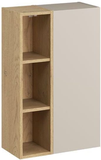 zestaw: półsłupek 1 drzwi+regał górny 20cm szerokość 50 cm wysokość 80 cm głębokość 27 cm materiał: płyta laminowana kolor: kaszmirowy mat, dąb Cremona 1 drzwi uniwersalne "push to open", 3 wnęki otwarte do samodzielnego montażu sposób montażu: podwieszany