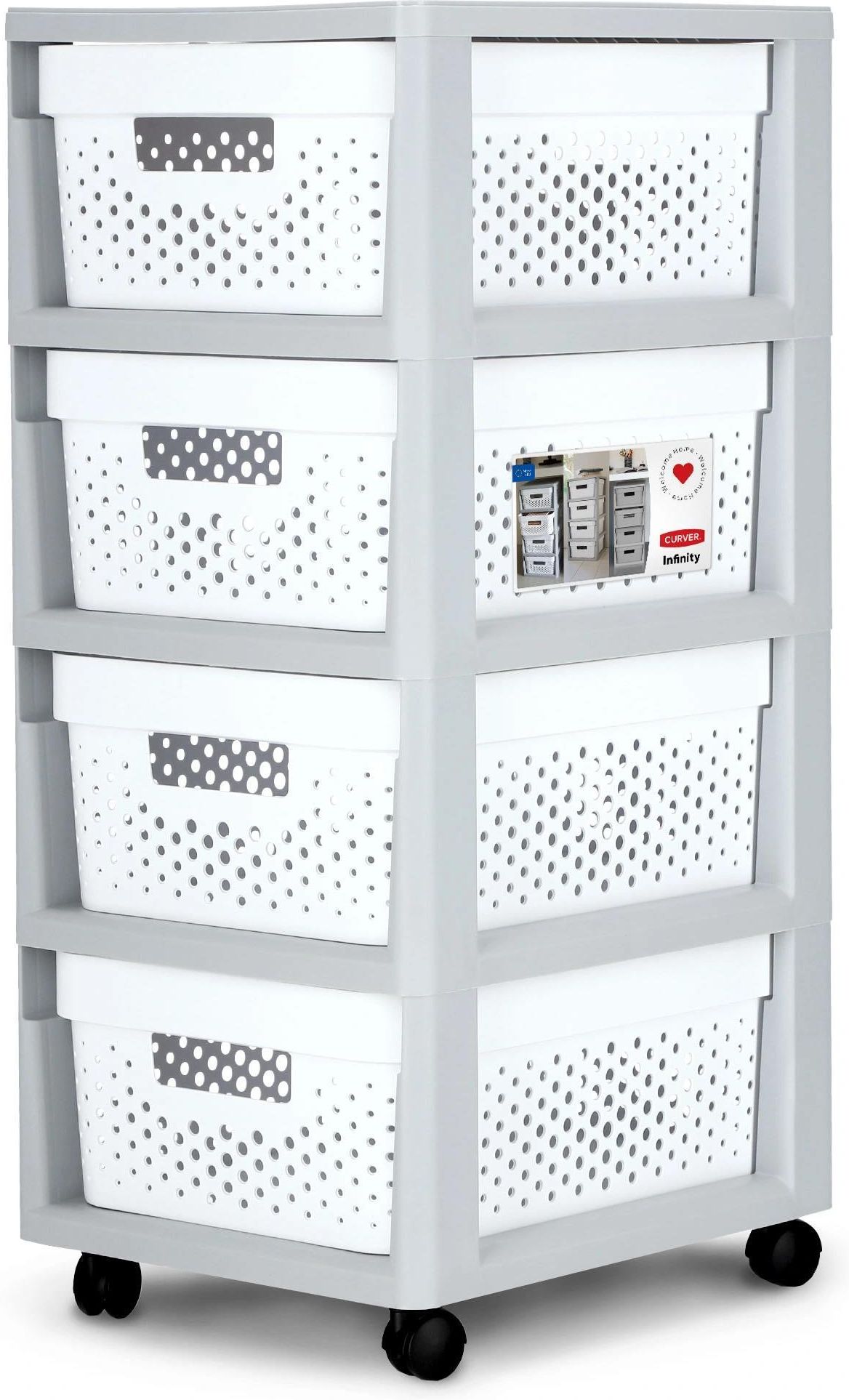 Regał szaro-biały z ażurowymi szufladami 4 x 11L Regał w kolorze szaro-białym świetnie pomieści wszystkie drobiazgi. Dzięki czterem szufladom z łatwością posegregujesz swoje najbardziej potrzebne przedmioty. Regał świetnie sprawdzi się zarówno w łazience jak i sypialni. Do sypialni, do kuchni... …