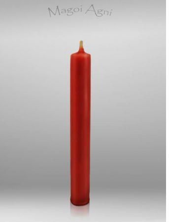Ogień od zawsze fascynował ludzi. Jeden z żywiołów który najbardziej przeraża człowieka. Odkąd człowiek wprowadził ogień do swoich jaskiń, zawsze towarzyszył mu nie tylko w życiu codziennym ale też w różnych obrzędach i rytuałach. Ogień do dzisiaj występuje w obrządkach i rytuałach wszystkich wierzeń i religii. Począwszy od momentu chrztu, gdzie zapalają nam gromnice, po świece i kadzidło w kościele i świeczki w dniu naszych kolejnych urodzin. Przez całe życie będzie nam towarzyszył, a ostania rzeczą w tej naszej inkarnacji będzie świeczka na nasze pożegnanie. Wibracja ognia i rytuały z nim związane mają silne działanie oczyszczające. Podnosi wibracje i tym samym poprawia energetykę przestrzeni wokół nas. W połączenie z naturalnymi kadzidłami stał się nieodłączny składnikiem religii, magii, rytuału, oraz zwykłego poprawiania samopoczucia Świeca intencyjna i rytualna powinna być z naturalnego wosku. Nasze świece wykonane są ręcznie w sposób tradycyjny. Drobne niedoskonałości tylko potwierdzają, że nie są to świece robione maszynowo. Świece z parafiny, czyli produktu ropopochodnego robione maszynowo mają zbyt niską wibrację, aby zapewnić oczekiwane rezultaty. Barwiona w masie, a nie tylko oblana czerwonym woskiem. Taka rytualna świeca oddala negatywne energie. Przede wszystkim ochrania. Spala to, co nagromadziło się zupełnie niepotrzebnego. Odsuwa od nas byty i myślokształty. Najlepszy dzień na oczyszczanie pomieszczeń to sobota. Kolor Czerwony - Siła życiowa, witalność, moc, determinacja, szczęście, namiętność, ochrona zdrowia, energia, siła fizyczna i psychiczna, odwaga, entuzjazm, ochrona przed wypadkami, wzmacnia naszą seksualność i namiętność. Ulecza związki partnerskie, pozwala na znalezienie tej jednej jedynej miłości życia.. Rytuały : Rytuały ochronne, miłosne, seksualne, wzmacniające. Wymiary: 9 cm x 1,2 cm . Czas spalania ok. 2 godz.