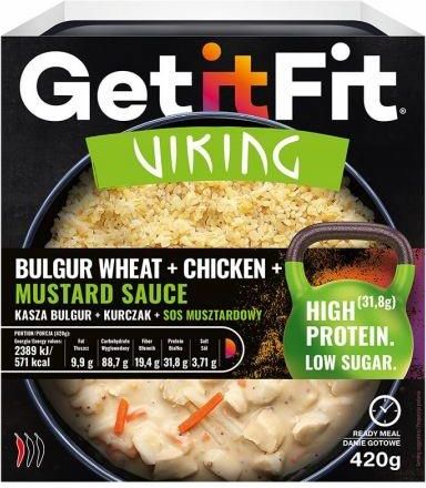 Get It Fit Viking posiłek wysokobiałkowy 420g Bywają dni, że ugotowanie obiadu to nie lada wyzwanie. W czasach kiedy mamy dużo zajęć i jesteśmy w ciągłym biegu warto zastanowić się nad alternatywą. Danie wysokobiałkowe Get it Fit to posiłek, który nie zawiera konserwantów, sztucznych barwników i aromatów. Dodatkowo pozbawiony jest GMO i wzmacniaczy smaku. Dużą zaletą tego posiłku jest to, że składa się tylko z naturalnych składników. Często gotowe dania wymagają tego, aby trzymać je w lodówce. W przypadku posiłku Get It Fit nie jest to konieczne, ponieważ jest on poddawany specjalnym procesom technologicznym, które zapobiegają psuciu się jedzenia. Posiłek wysokobiałkowy Get It Fit można odgrzać w mikrofalówce, na patelni, w wodzie lub w garnku. Idealnie sprawdzi się do pracy lub po treningu. To co jeszcze jest ważne w przypadku tego produktu – producent zadbał o to, aby opakowania i tacki w pełni nadawały się do recyklingu. Mamy więc pewność, że zyskujemy smaczny posiłek i jednocześnie nie szkodzimy środowisku. Skład: Kasza bulgur 44% (gluten), filet z kurczaka 20% (filet z kurczaka, sól), woda, musztarda 6% (woda, gorczyca, ocet winny jabłkowy, koncentrat soku jabłkowego, sól, przyprawy), marchew 5%, seler, pasternak 2,2%, koncentrat soku jabłkowego, śmietanka UHT 18% (mleko), olej rzepakowy, niemodyfikowana skrobia kukurydziana, ocet winny jabłkowy, sól kamienna, pietruszka 0,6%, por, sos sojowy (soja, gluten), mieszanka przypraw, aromat naturalny. Produkt zawiera: mleko, gluten, soję, gorczycę, seler. Może zawierać: rybę, orzeszki arachidowe i inne orzechy. Waga: 420g Wartość energetyczna: 571 kcal (w 420g)