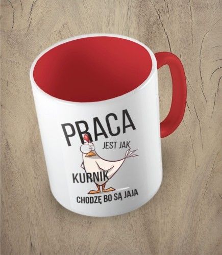 Zabawny kubek do pracy na prezent. Kubek z napisem "praca jest jak kurnik. Chodzę bo są jaja".