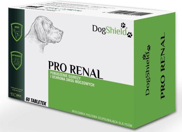 Pobudzenie diurezy i ochrona dróg moczowych. Skład: 1 tabletka zawiera: chitozamina ze zwierząt wodnych 50 mg (8,3%), stearynian magnezu, dodatki: - produkty naturalne botaniczne: wyciąg z żurawiny wielkoowocowej (Vaccinium myrtillus) 300 mg (zawiera 30 mg proantocyjanidyn), wyciąg z pietruszki (Petroselinum sativum) 100 mg - spoiwa: celuloza mikrokrystaliczna, krzemionka koloidalna Składniki analityczne i poziomy: białko surowe 0%, włókno surowe 24%, oleje i tłuszcze surowe 1%, popiół surowy 7,2% Właściwości i działanie Pro Renal dostarcza składników o działaniu moczopędnym i ochronnym na drogi moczowe. Wyciąg z żurawiny (Vaccinium macrocarpon) jest źródłem wielu substancji biologicznie aktywnych takich jak: flawonoidy, katechiny, antocyjany, witaminy (C, B1, B2, E) i mikroelementy (żelazo). Oligomeryczne proantocyjany (OPC) żurawiny zmniejszają ryzyko wystąpienia stanów zapalnych dróg moczowych, gdyż ograniczają przyleganie bakterii do nabłonka układu moczowego, co w konsekwencji utrudnia bakteriom rozwój. Wyciąg z pietruszki zwyczajnej (Petroselinum sativum) działa moczopędnie i odtruwająco. W połączeniu z żurawiną zwiększa wypłukiwanie bakterii wraz z moczem. Chitozamina pobudza tworzenie warstwy ochronnej na błonie śluzowej pęcherza moczowego. Instrukcja stosowania Cel stosowania: Wspomaganie funkcji nerek poprzez nasilenie produkcji moczu oraz działanie zapobiegające rozwojowi bakterii w drogach moczowych. Sposób stosowania: Podawać podczas posiłku w ilości: 1 tabletka na psa do 10 kg m.c., 2 tabletki na psa 10-25 kg m.c., 3 tabletki na psa powyżej 25 kg m.c. dziennie. U dużych psów dawkę dzienną można rozbić na 2 podania. Opakowanie: 60 tabletek