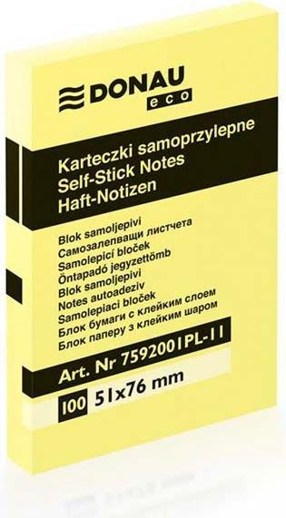 substancja samoklejąca usuwalna za pomocą wody karteczki w kolorze żółtym idealne do przekazywania wiadomości ilość karteczek 100 gramatura papieru 70g/m klej umieszczony wzdłuż dłuższego boku wymiary 51x76mm